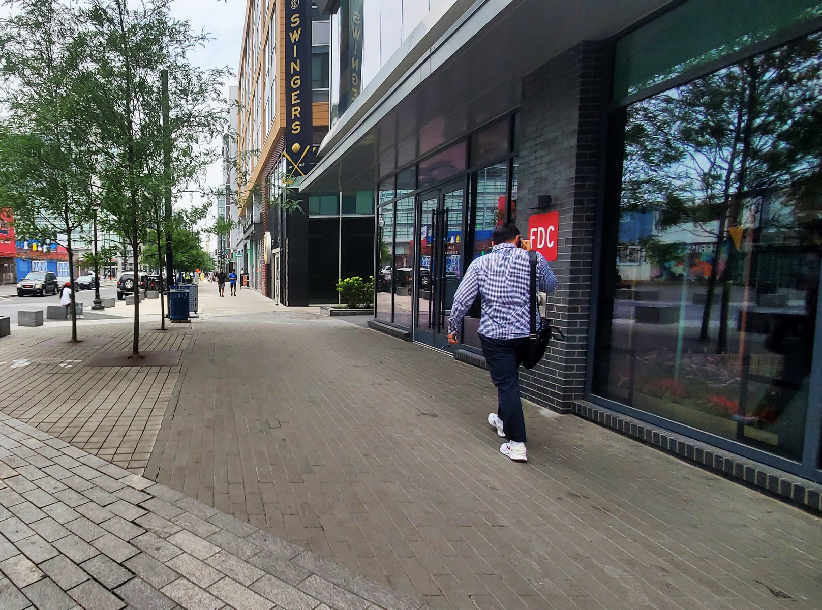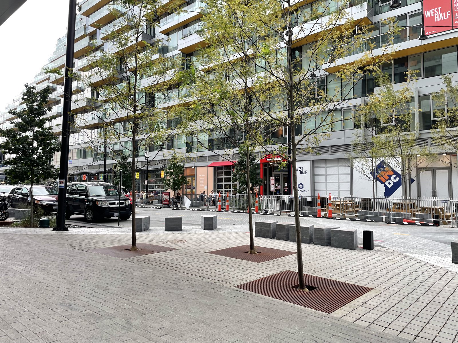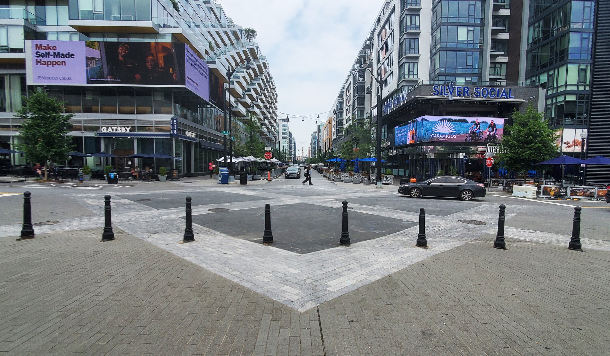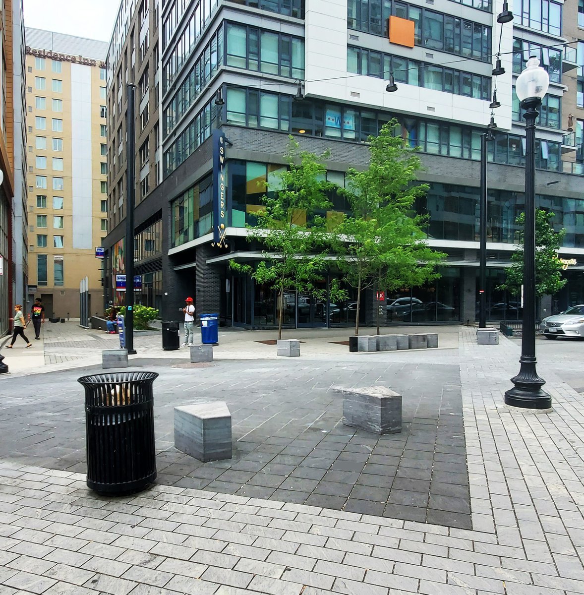 Set within the dynamic landscape of DC’s Capitol Riverfront and neighboring the Washington Nationals baseball stadium, Future Green’s Half Street project is a mixed-use streetscape that integrates vehicular, pedestrian, and retail use, utilizing bioswales and other soft infrastructure to manage water runoff at this river-adjacent site. The design lays out a curbless street with an iconic paving pattern – derived from the organizing geometries of L’Enfant’s 1791 plan for the city of DC – to orient pedestrians and create a sense of landmark. This woonerf design allows for flexible use and allows the closure of the street on gameday and for other cultural events. Sculptural stone benches evoke local quarry-drawn slabs, which are artfully sliced to create a variety of seating experiences. Playful street lighting and movable furniture create a sense of identity for visitors. Sheltering allées of trees are paired with parallel planted bioswales, simultaneously managing groundwater and delineating space. This landscape-driven plan for Half Street’s public realm creates thoughtfully-curated street life on gameday and every day.