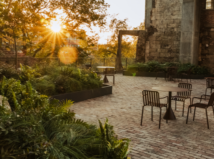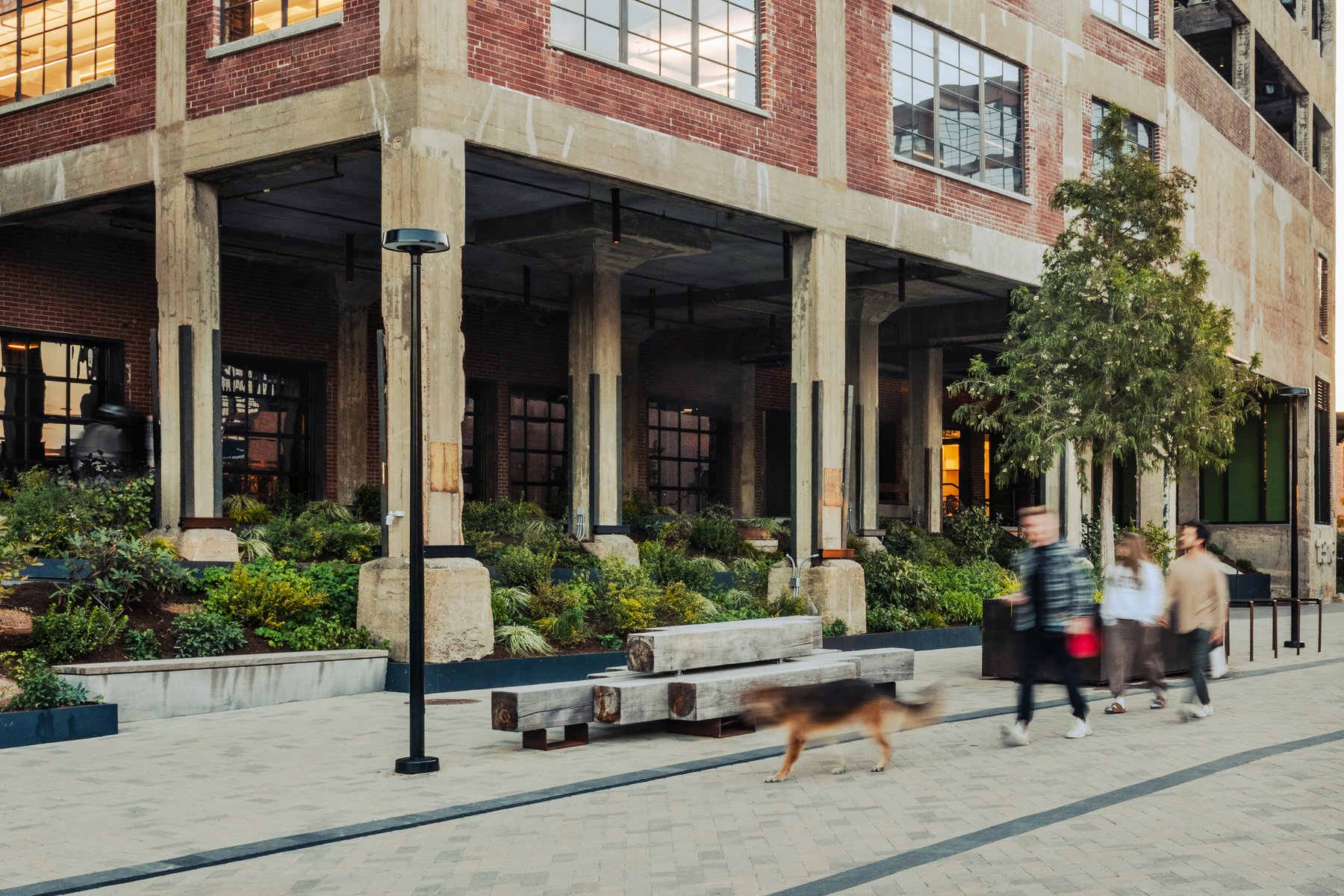 Circulation across the site will be a nod to historic hill towns - steep topography to negotiate, varied scale of open spaces and passage ways between buildings, and lookouts to the river beyond, on which the site’s history will be revealed as traces across the landscape. The open spaces will be framed garden rooms that will each exude its own identity. Existing concrete slabs once hand-chiseled for livestock hoof traction will be salvaged as specialty pavers. Cues from the forgotten, overgrown, and wild planting are interpreted and expressed as gestures throughout the site to maintain the ethos and authenticity of being a found landscape. Plants will cascade from facades, trace building columns, and grow from curated concrete slab gardens. Adams Street will be redefined as a curbless shared street with a pedestrian priority. Four landscaped and programed barges will be anchored at the foot of the site connecting the land with river life.