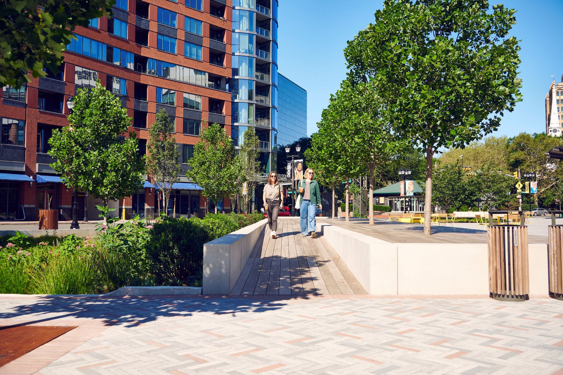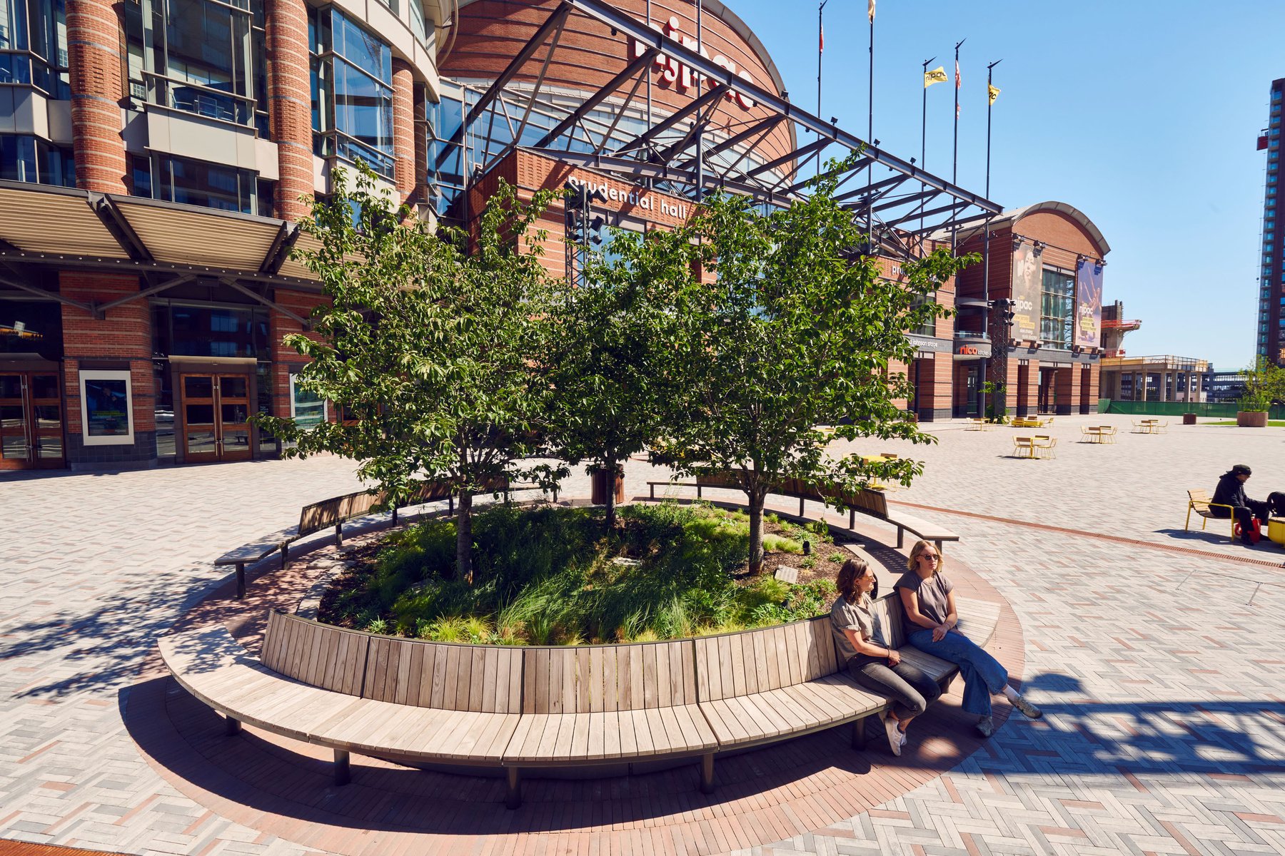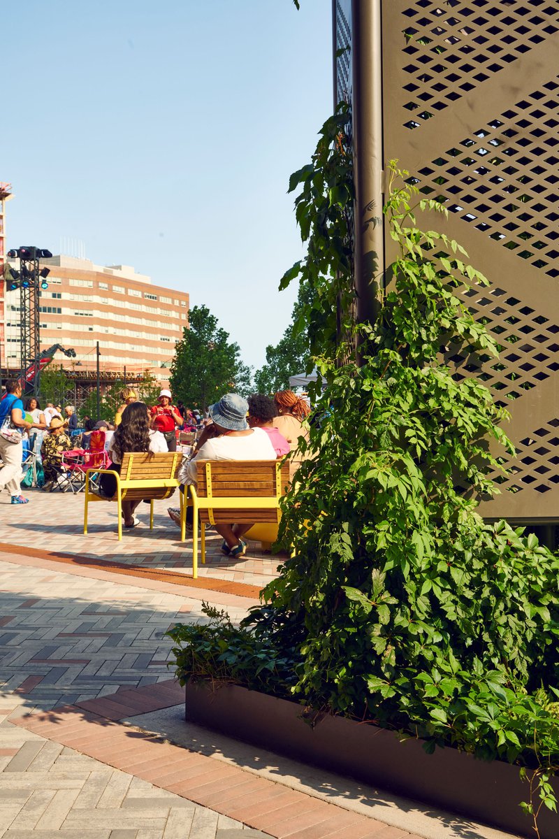 NJPAC is the heart of a new Art’s District that includes a series of mixed use residential, retail buildings, and low-rise residences situated around a pedestrian friendly streetscape. Landscape scope includes a 40,000 SF performance plaza, a transit plaza that serves the NJ light Rail, and a shared street. The residential Mews provides a leafy green pedestrian street and the Residential towers include a series of lush terraces with opportunities for dining and lounging. Inspired by the NJPAC institution, the landscape design provides an inclusive and flexible design that gives the local community a much-needed vibrant green streetscape and an outdoor living room experience. A connective stone carpet unites the district with a series of programmatic interventions, such as a large flexible lawn, two-way stacked seating, a social circular bench, oversize movable loungers and art programming. A series of truss-like vine columns anchor the central stage and lawn area, providing a support for temporary tent structures, and state of the art stage lighting. The planting scheme is designed with the ecological, poetic, and seasonal performance of the plants in mind. This ecological framework serves the local flora and fauna and helps mitigate pressure on the adjacent Passaic River.