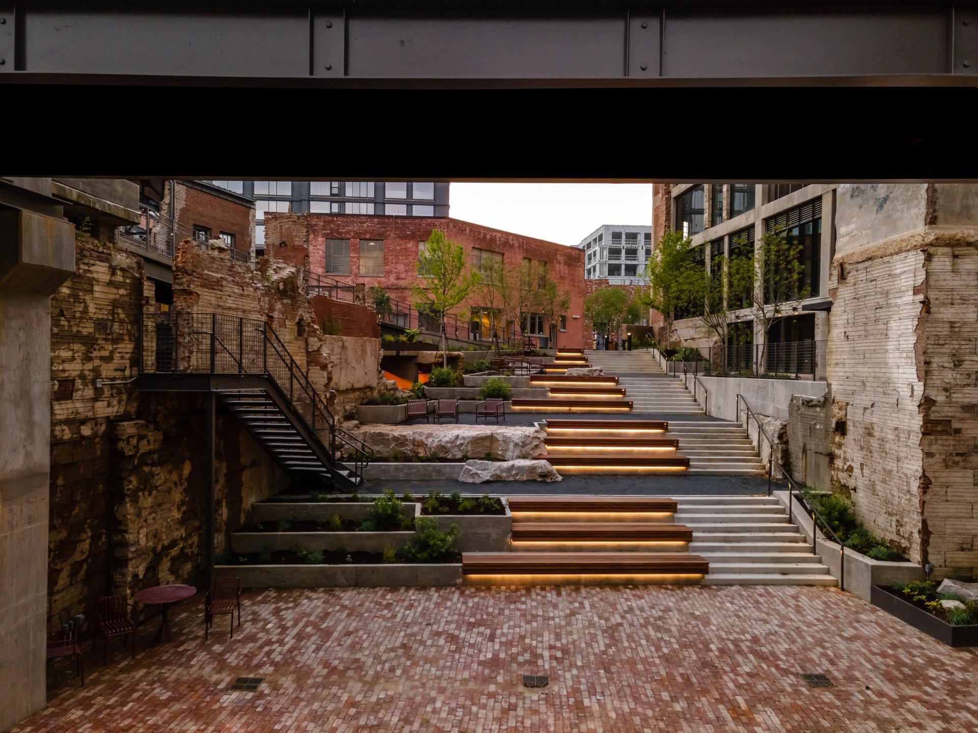 A landscaped ampitheater leads to the Cumberland River edge in Nashville's Neuhoff District