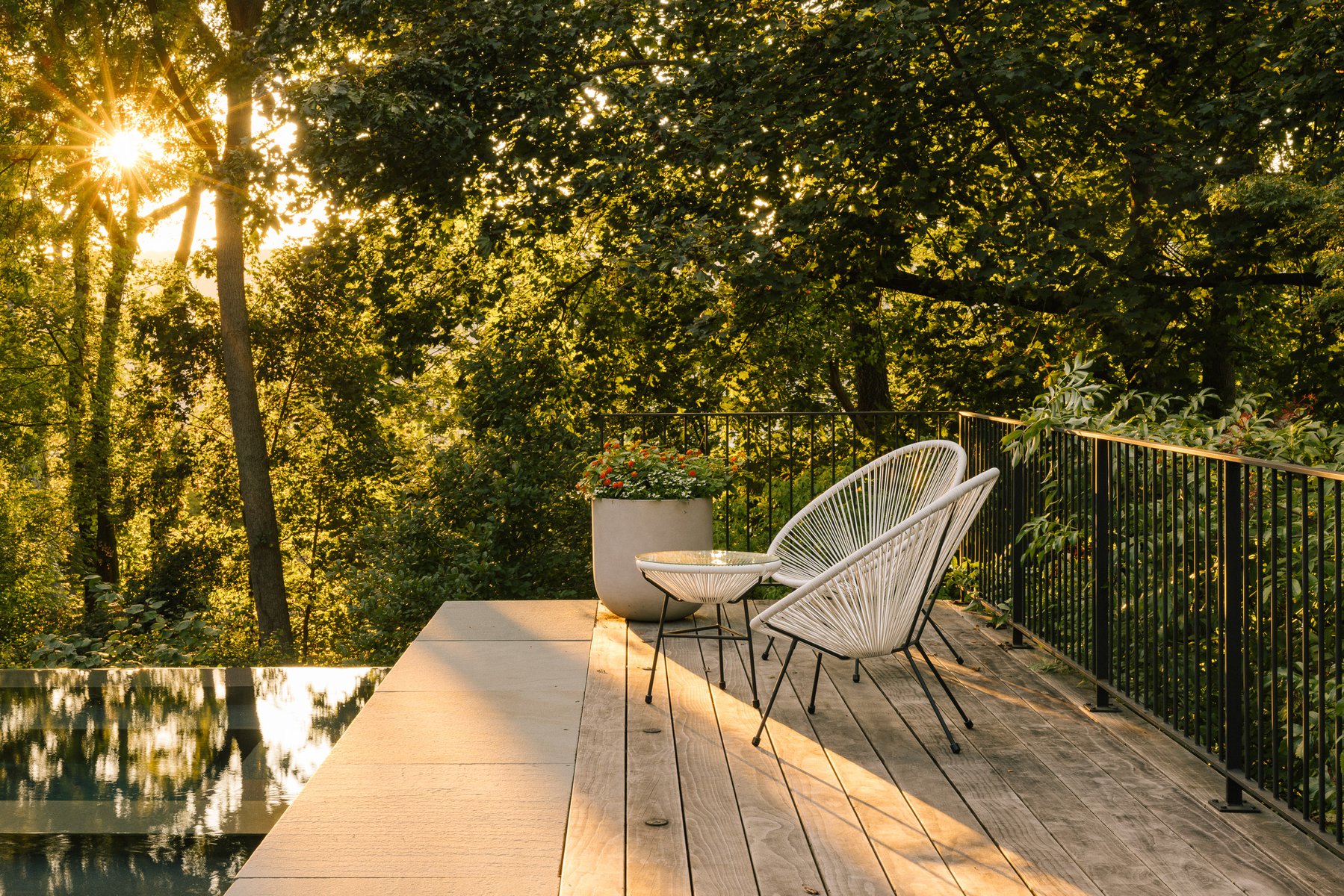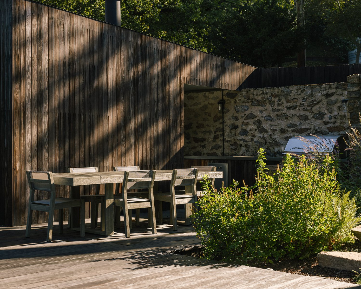 To seamlessly integrate the landscape with its wooded context, the plant palette incorporates a diverse range of native plants, including ferns, low-bush blueberries, and rhododendrons along the site’s perimeter. The pool terrace and garden steps are adorned with traditional ornamental plants such as lilacs, thyme, lavender, and butterfly weed, complemented by ornamental grasses.