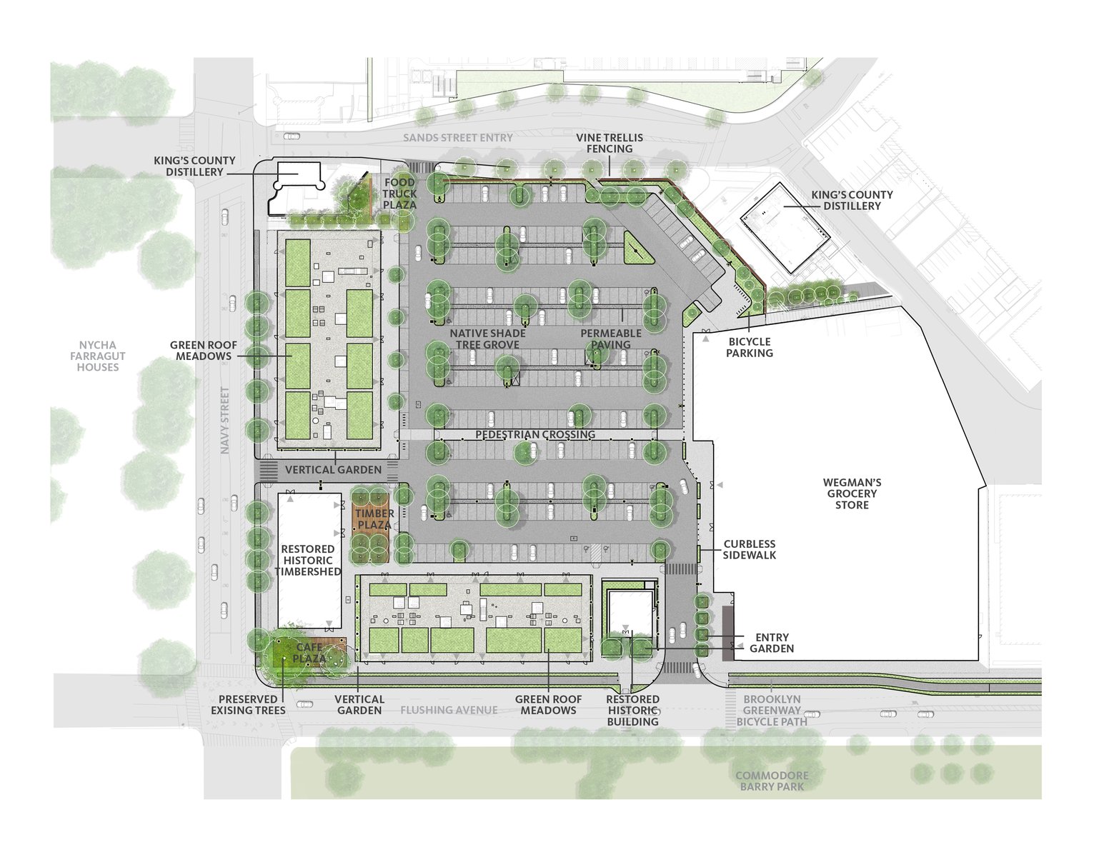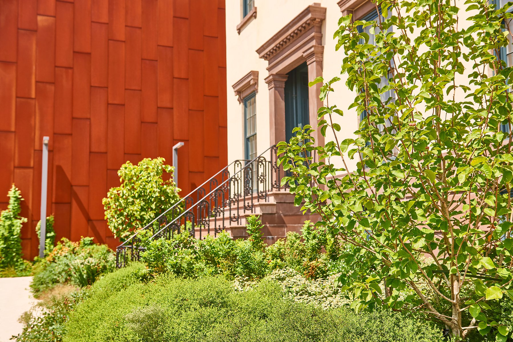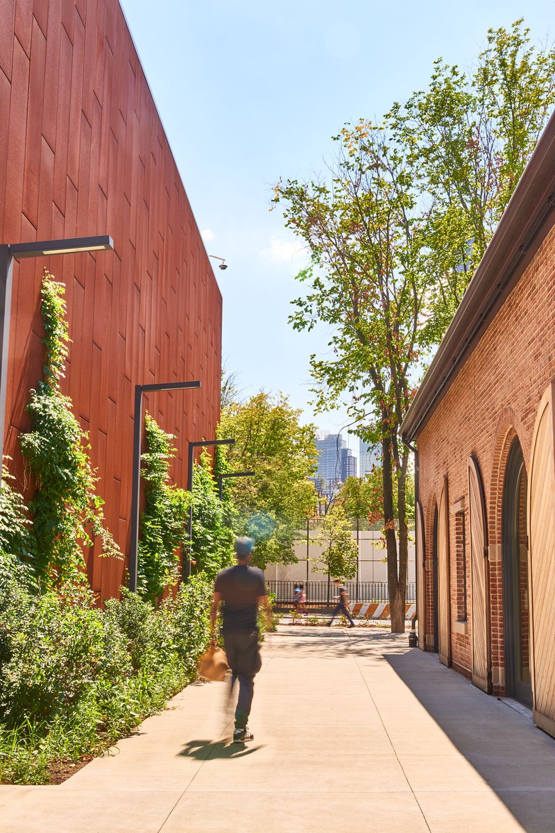 Admiral’s Row – a historic stretch of officer housing in the Brooklyn Navy Yards dating back to the Civil War – has been derelict and closed to the public for nearly half a century. As part of the ongoing renewal and reuse of the Navy Yards for commercial and light industrial development, Future Green had the opportunity to reimagine this landscape for public access, embedding historic and contemporary details into newly-crafted public plazas across this 7-acre site. In response to the site’s location within the FEMA flood zone, Future Green developed a diverse palette of native plants and rugged ‘pioneer species’ able to tolerate the high-salt, high-traffic setting; sophisticated systems below-ground capture and redirect parking-lot stormwater away from the East River and Upper New York Bay. Newly planted flowering trees, including a historic Magnolia cultivar, tie into the beloved Old-World streetscape of nearby historic Brownstone Brooklyn.