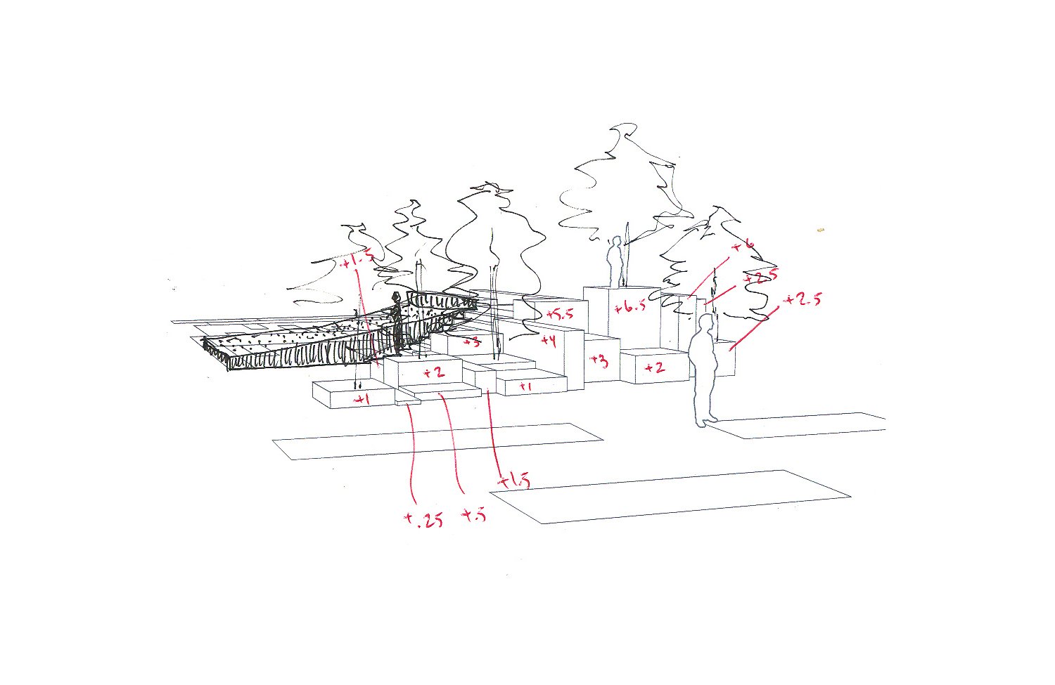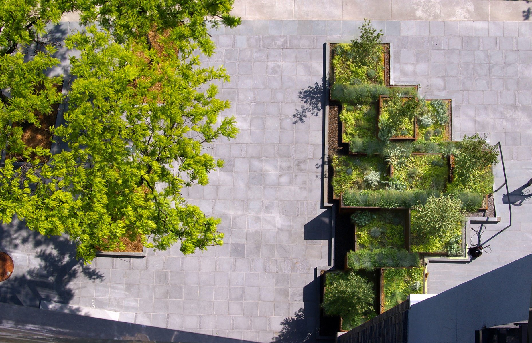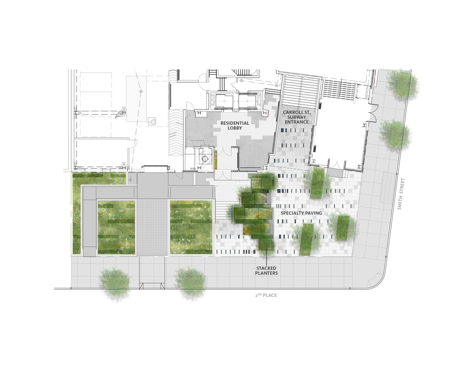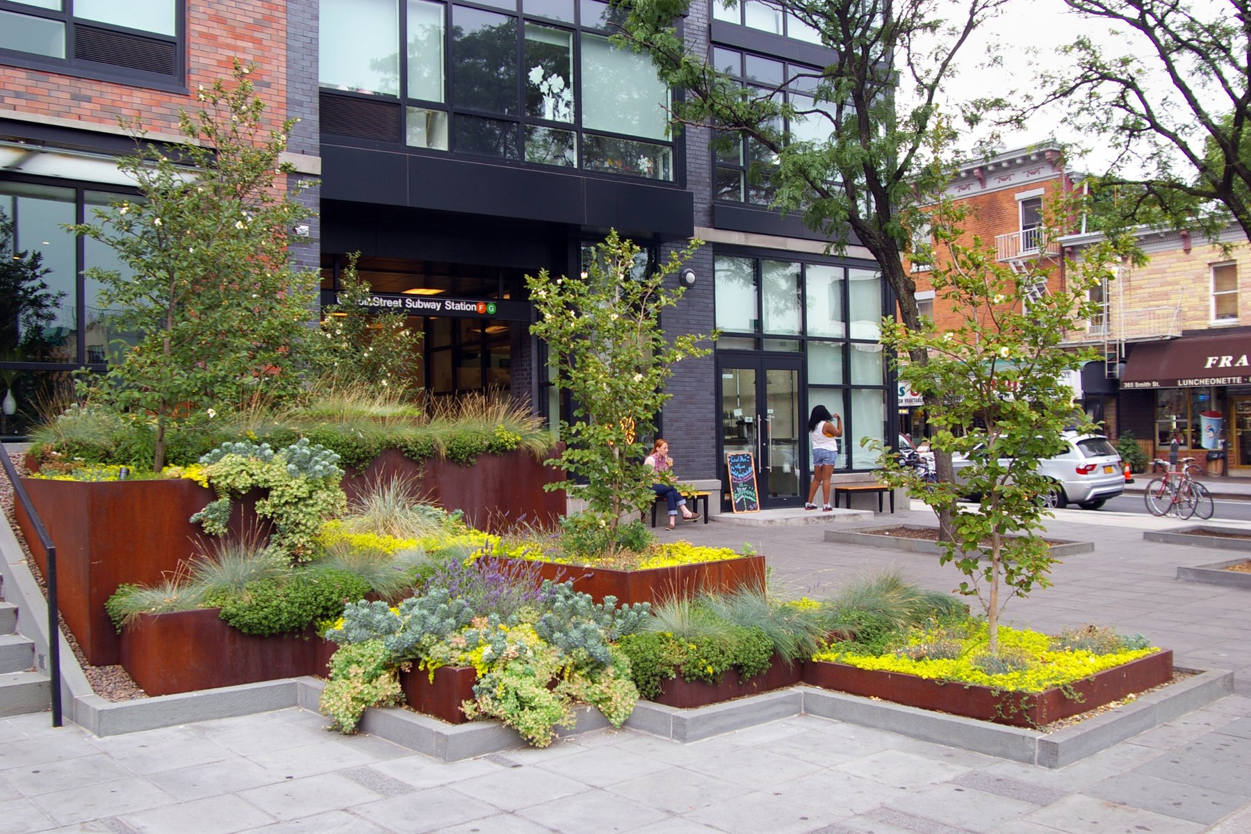 Carroll Street MTA Plaza is a strategic, small-scale public project with a big impact on daily quality of life. Our design addresses the dominant conditions on site – movement and sound, with train traffic below and pedestrians flowing in and out of the station. A landscape of bluestone paving, stacked corten steel planters, and cascading drought-tolerant plantings create an iconic new Brooklyn plaza and mediate between diverse spatial stakeholders: a quiet residential block in a historic Brooklyn neighborhood; a subway entrance hosting a 3-million annual ridership; and the nearby post-industrial edge of Gowanus. The geometry of the entrance design acoustically softens but visually echoes the lively vibrations of train traffic and commuter crowds. Atop the adjacent building, a substantial roof meadow offers sustainable stormwater capture and expansive city views.