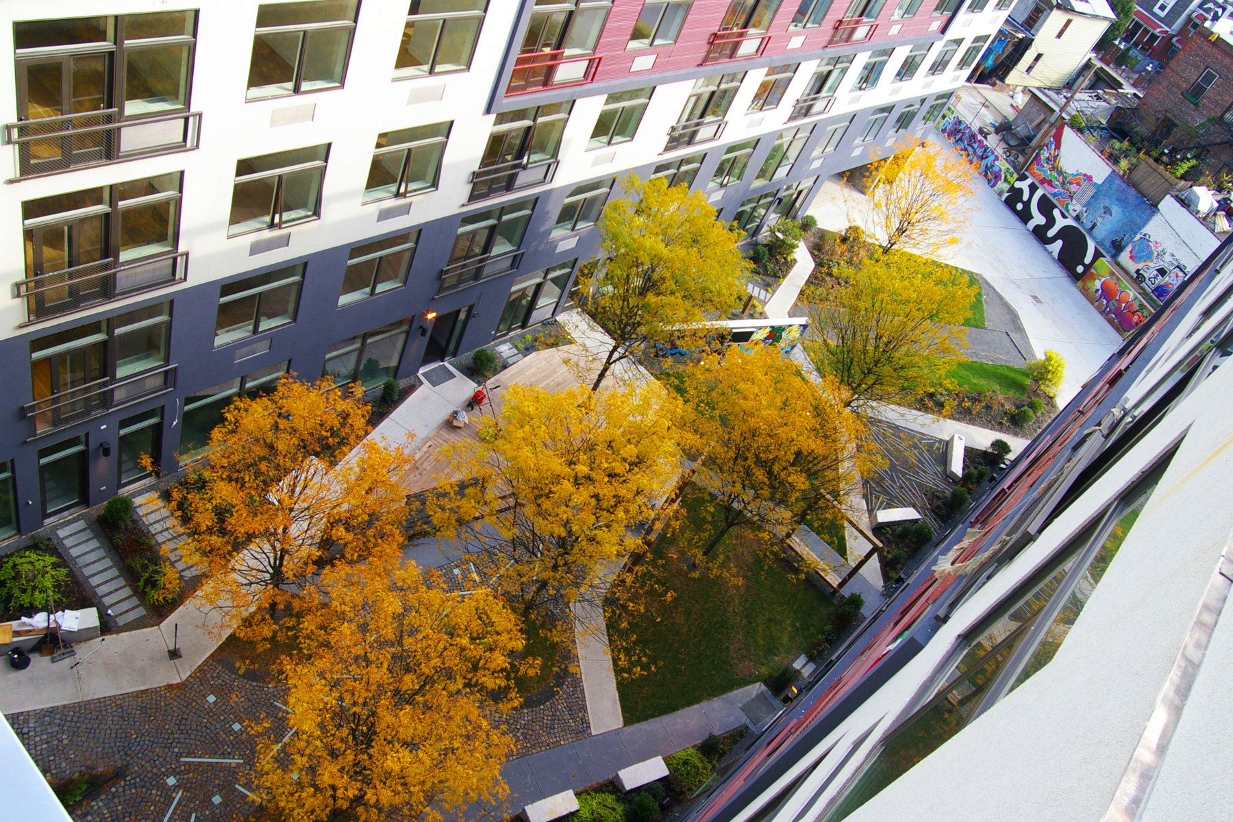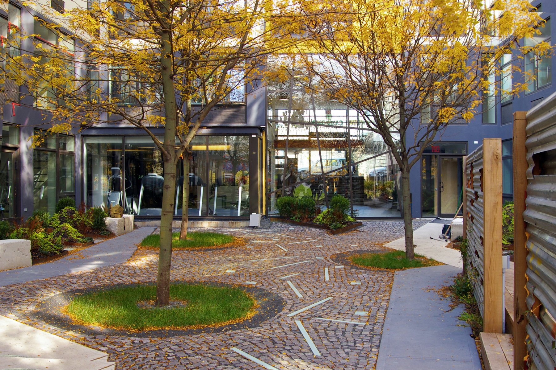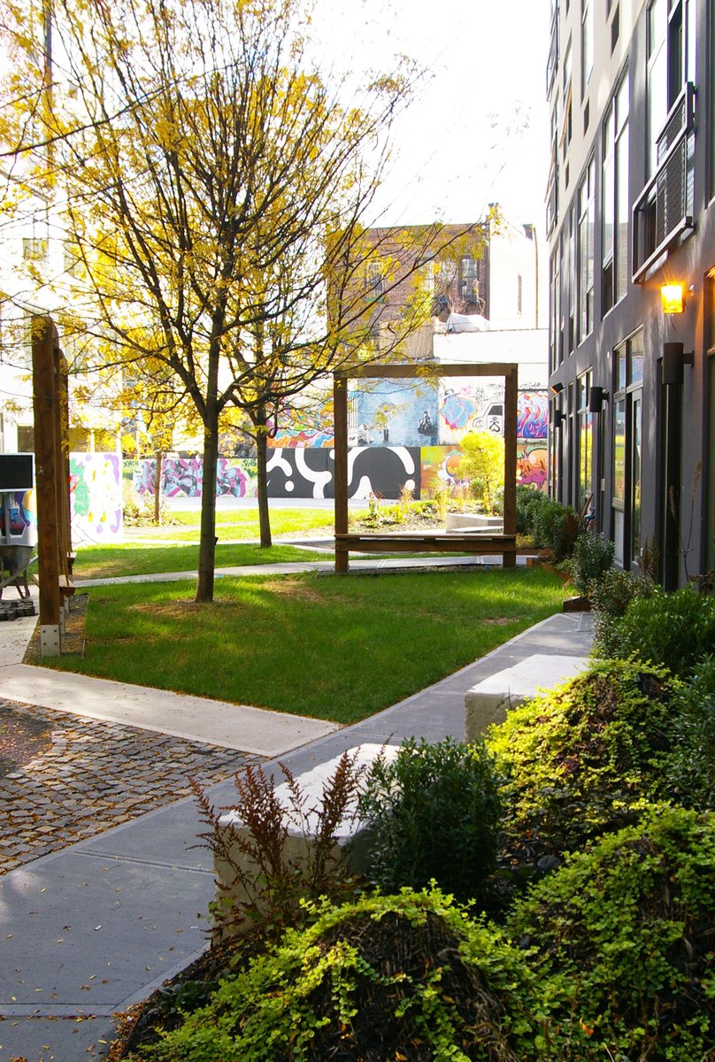 A veritable oasis of green amid the post-industrial urban fabric of Bushwick, Brooklyn, the design for Castle Braid’s residential courtyard echoes the angular, refracted lines of the site’s architecture and reflects the client’s vision to blend Bushwick’s past and future. The site’s former industrial use seriously impacted the soil, requiring skillful drainage and soil-profile reengineering on the part of Future Green in order to construct a lush courtyard garden of Honey Locust trees and conical landforms. Weaving, colored concrete paths carve out distinct pads for programming – a sustainable Black Locust wood deck provides café seating, an open lawn offers a chance to watch an outdoor movie, and a quiet garden allows for a day spent reclining in a hammock. A backdrop of graffiti murals by local artists sets off a dynamic landscape of play and lounge elements, including swings, a bocce court, and custom concrete benches located throughout the garden.