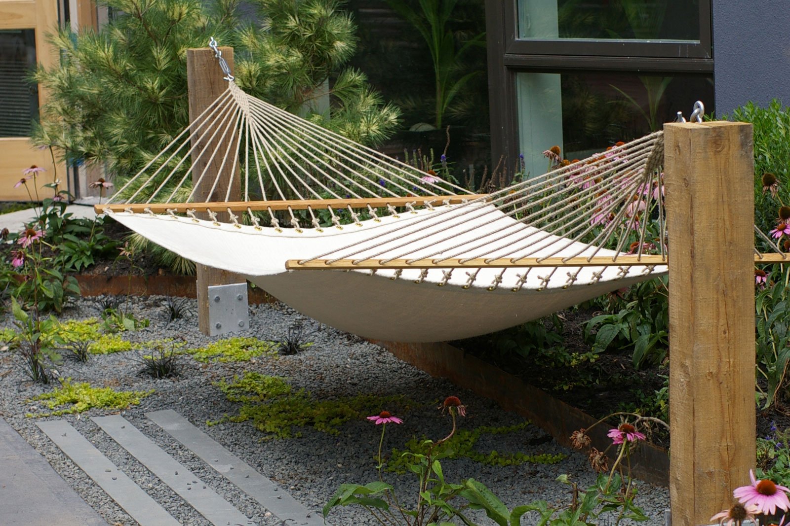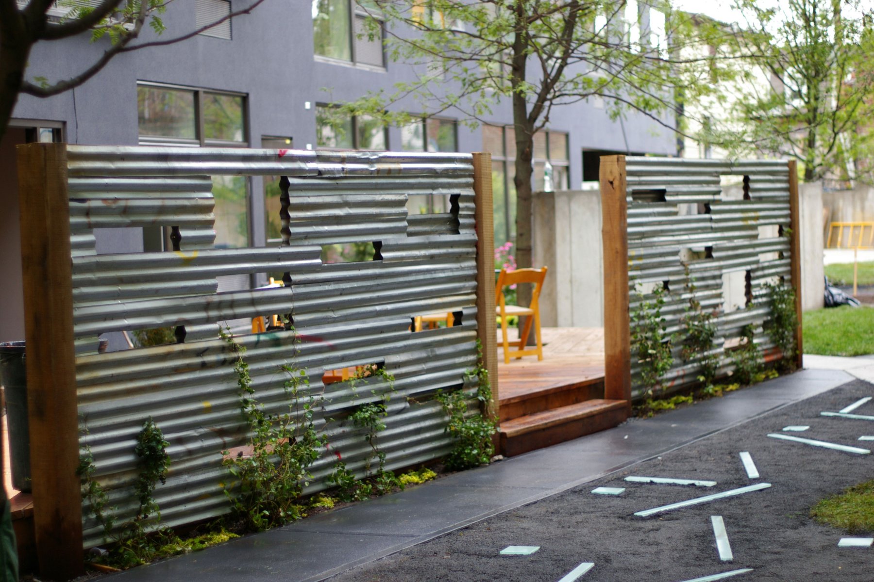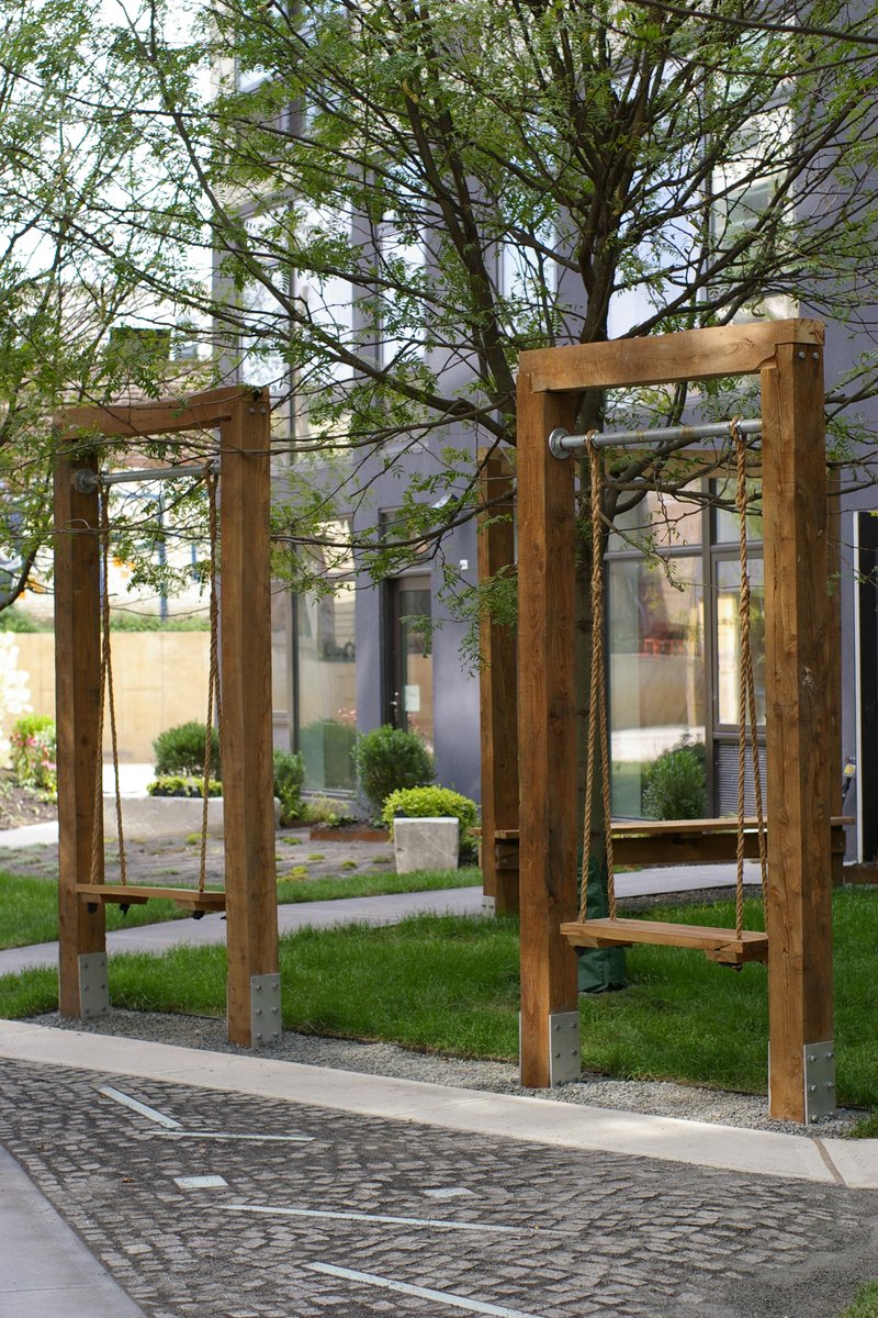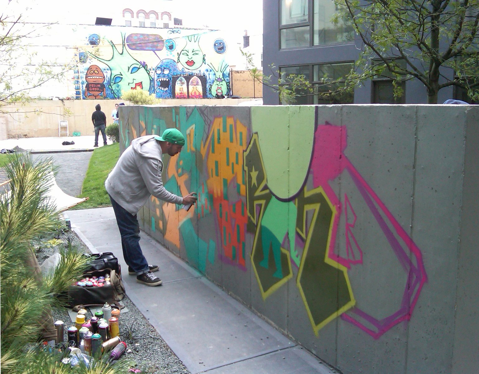 A veritable oasis of green amid the post-industrial urban fabric of Bushwick, Brooklyn, the design for Castle Braid’s residential courtyard echoes the angular, refracted lines of the site’s architecture and reflects the client’s vision to blend Bushwick’s past and future. The site’s former industrial use seriously impacted the soil, requiring skillful drainage and soil-profile reengineering on the part of Future Green in order to construct a lush courtyard garden of Honey Locust trees and conical landforms. Weaving, colored concrete paths carve out distinct pads for programming – a sustainable Black Locust wood deck provides café seating, an open lawn offers a chance to watch an outdoor movie, and a quiet garden allows for a day spent reclining in a hammock. A backdrop of graffiti murals by local artists sets off a dynamic landscape of play and lounge elements, including swings, a bocce court, and custom concrete benches located throughout the garden.
