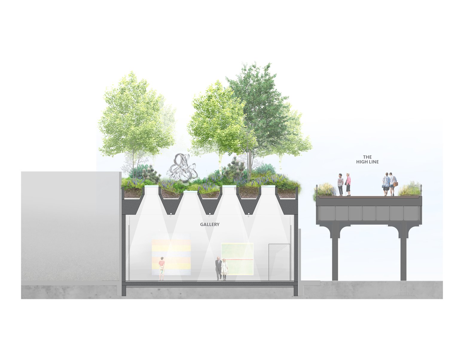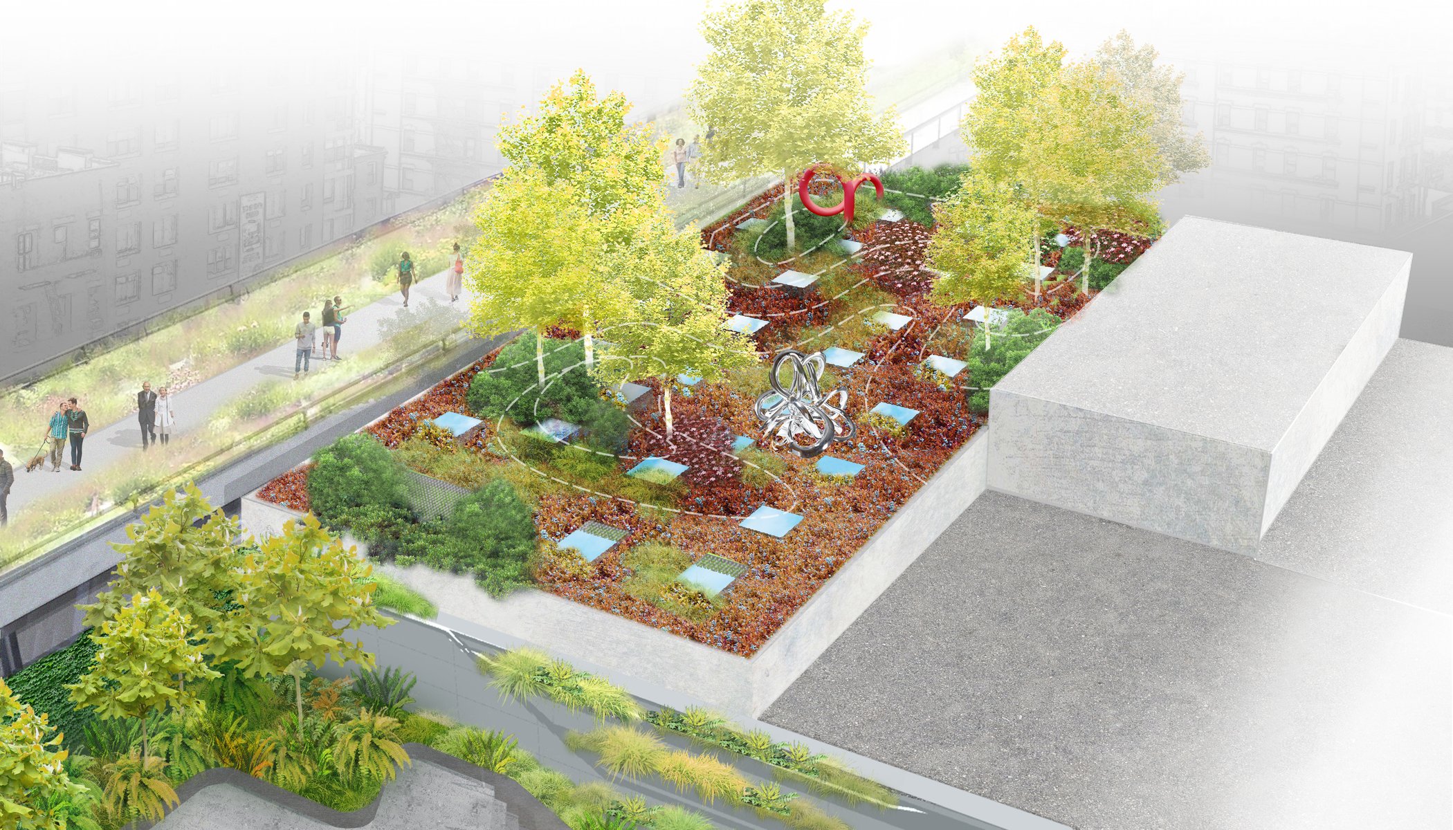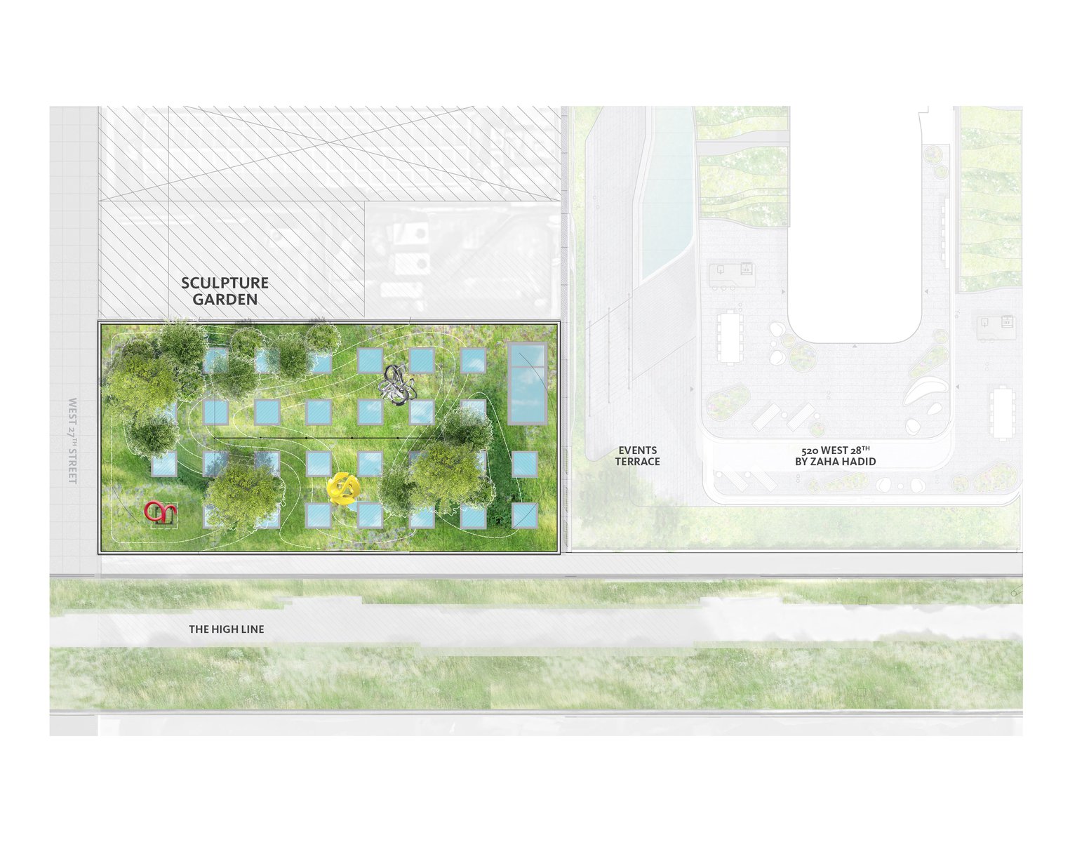 Viewed from the High Line, the garden serves as a verdant extension to the elevated park and showcases outdoor art works in a rich seasonal tapestry. The design presents a rolling topography with 28 skylights sculpted into a lush meadow surface. The undulating form at the surface provides soil depth for trees and shrubs, while the skylights provide natural daylight into the art space below as well as evening illumination.