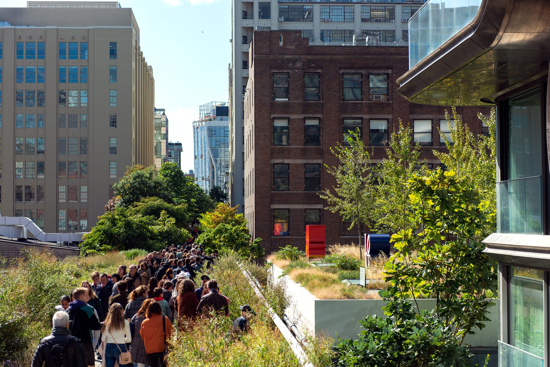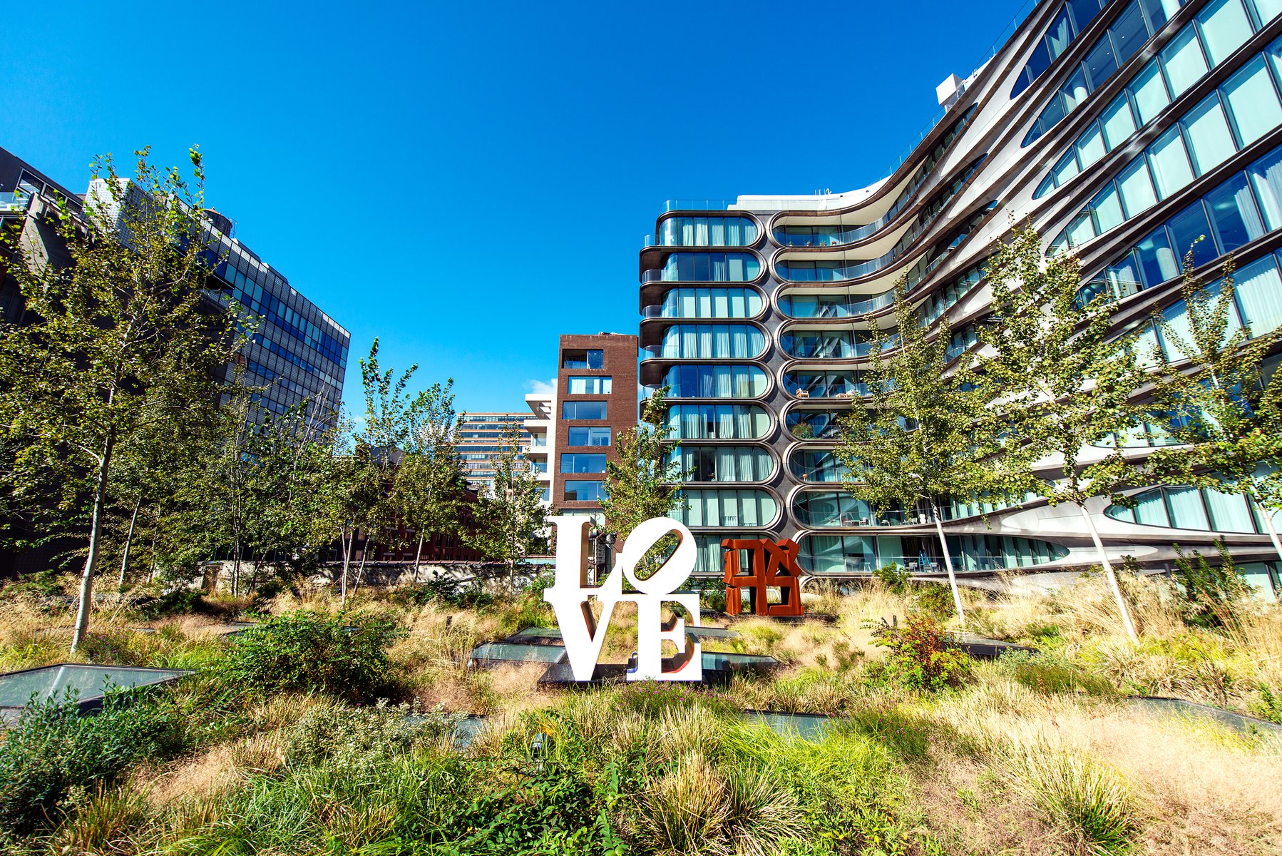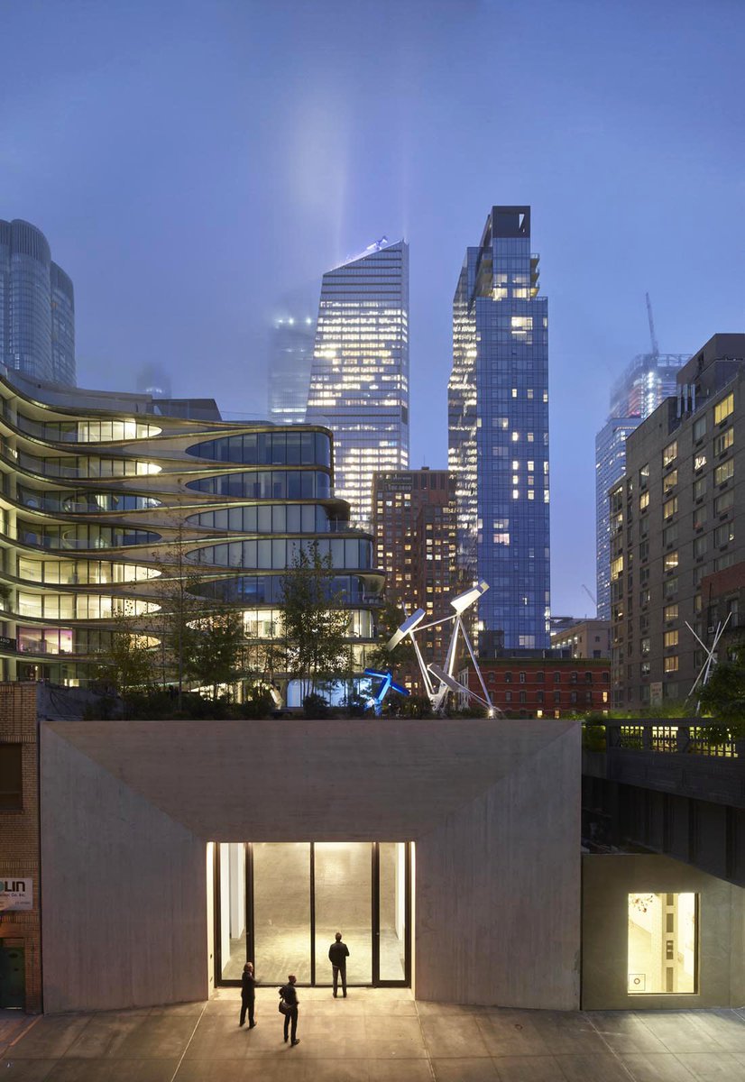 Viewed from the High Line, the garden serves as a verdant extension to the elevated park and showcases outdoor art works in a rich seasonal tapestry. The design presents a rolling topography with 28 skylights sculpted into a lush meadow surface. The undulating form at the surface provides soil depth for trees and shrubs, while the skylights provide natural daylight into the art space below as well as evening illumination.