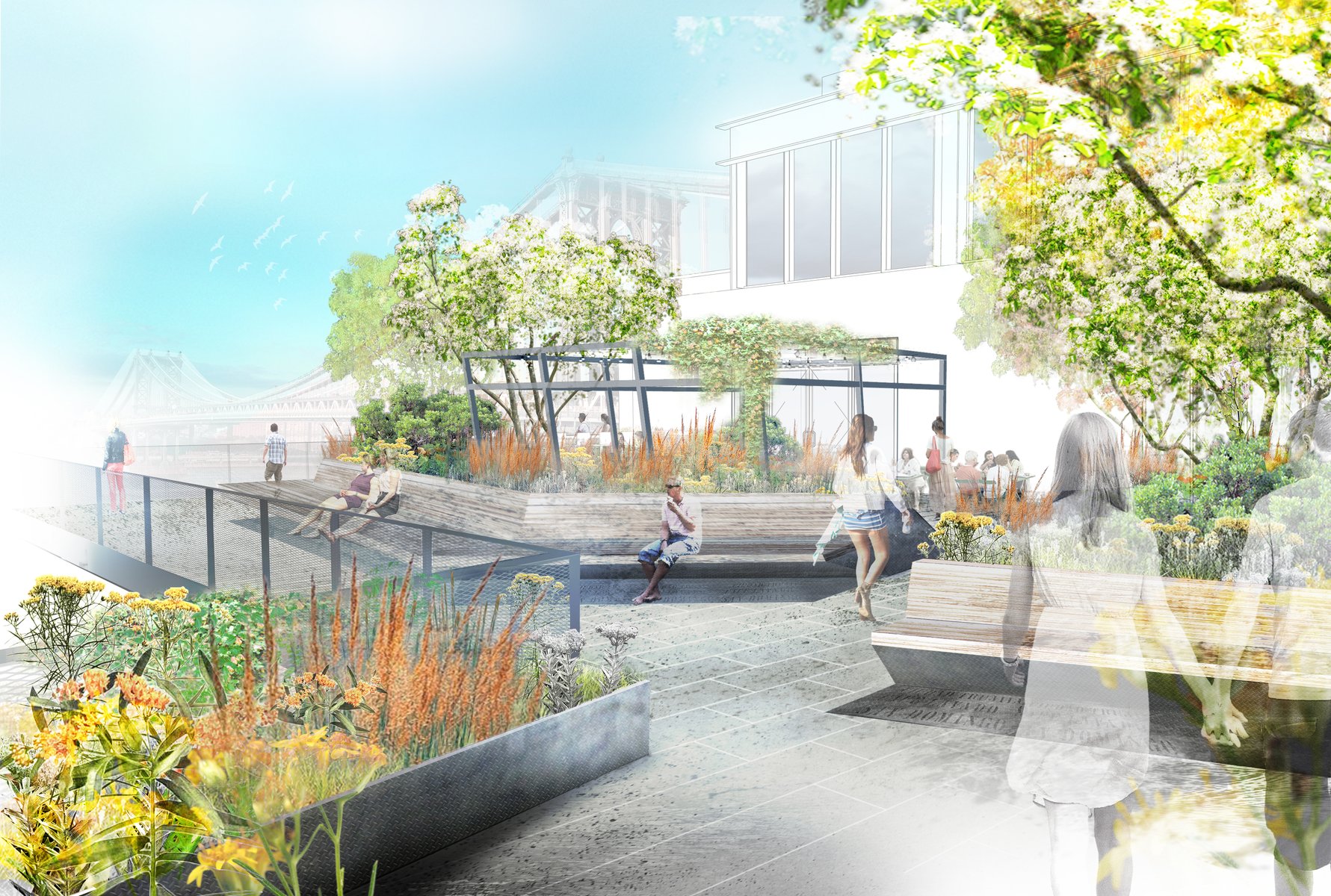 Long-abandoned Empire Stores – an 1869 coffee warehouse fronting along the wildly successful Brooklyn Bridge Park – is now home to retail stores, office space, restaurants, a beer garden, and an outpost of the Brooklyn Historical Society. Future Green’s landscape for the iconic structure comprises three components: a 7,000-square-foot rooftop public park (the first of its kind in the landscape repertoire of Brooklyn Bridge Park); an expansive 50,000 square feet of green roofs planted with wild and colorful meadow species; and a streetscape of charred cedar planters echoing the building’s working past.