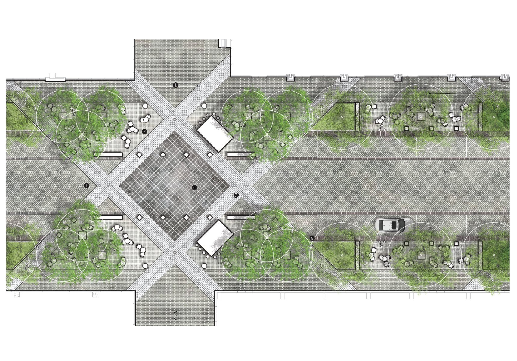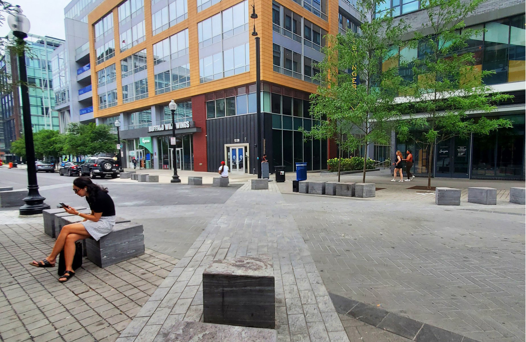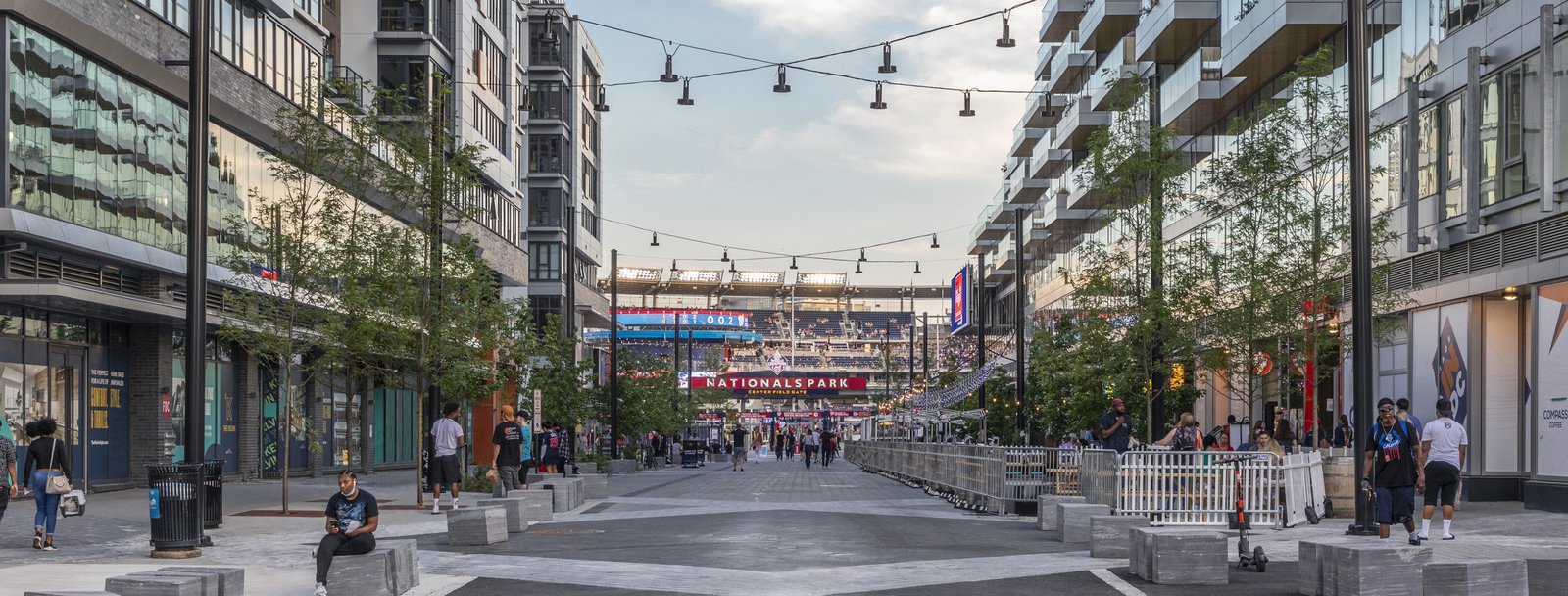 Set within the dynamic landscape of DC’s Capitol Riverfront and neighboring the Washington Nationals baseball stadium, Future Green’s Half Street project is a mixed-use streetscape that integrates vehicular, pedestrian, and retail use, utilizing bioswales and other soft infrastructure to manage water runoff at this river-adjacent site. The design lays out a curbless street with an iconic paving pattern – derived from the organizing geometries of L’Enfant’s 1791 plan for the city of DC – to orient pedestrians and create a sense of landmark. This woonerf design allows for flexible use and allows the closure of the street on gameday and for other cultural events. Sculptural stone benches evoke local quarry-drawn slabs, which are artfully sliced to create a variety of seating experiences. Playful street lighting and movable furniture create a sense of identity for visitors. Sheltering allées of trees are paired with parallel planted bioswales, simultaneously managing groundwater and delineating space. This landscape-driven plan for Half Street’s public realm creates thoughtfully-curated street life on gameday and every day.