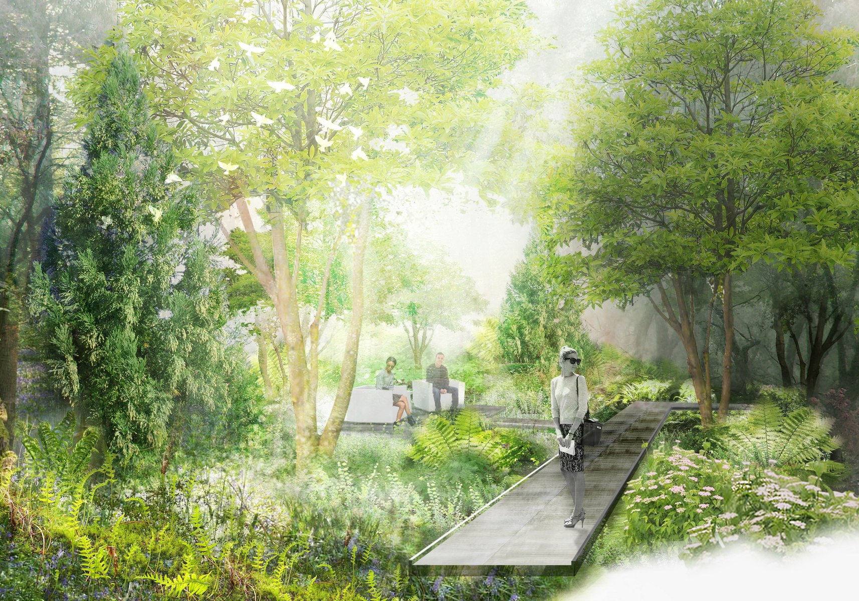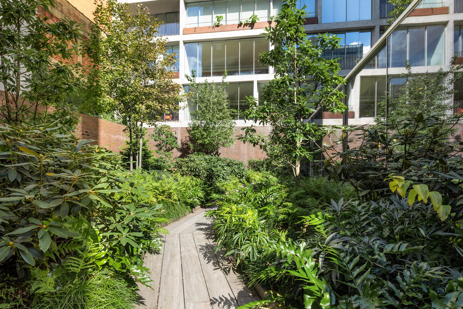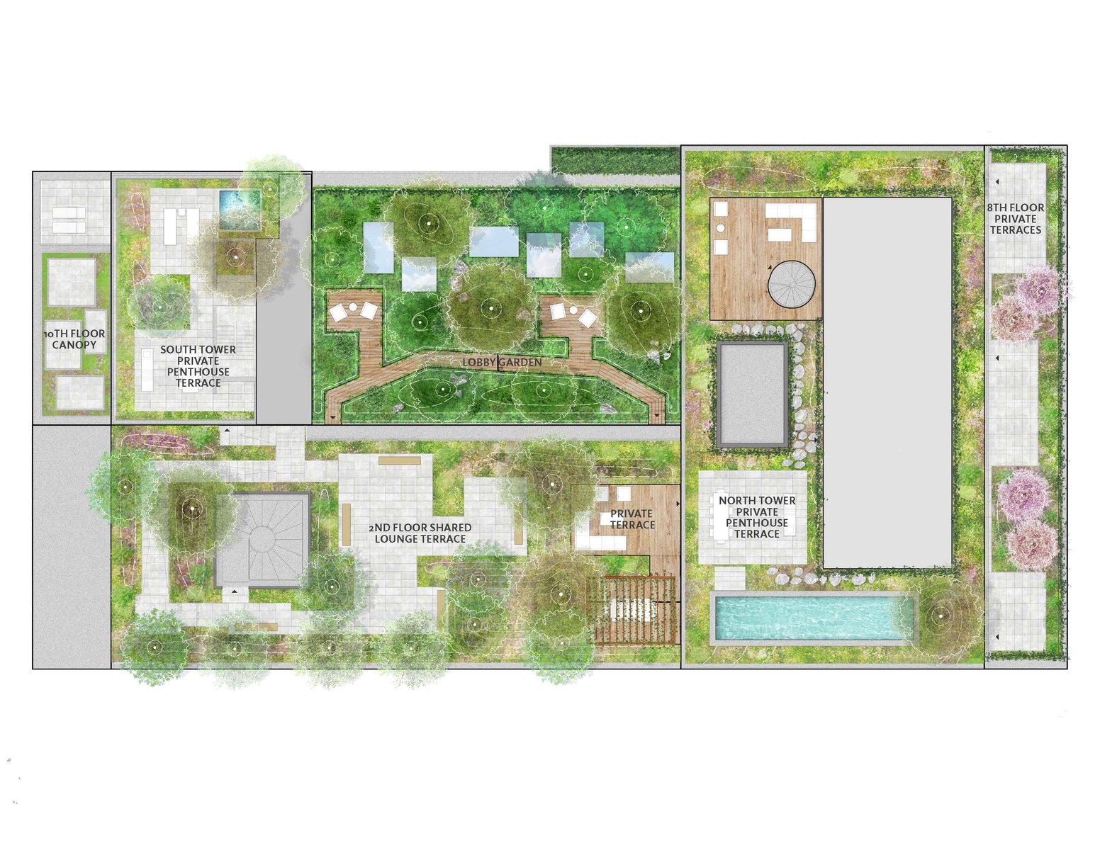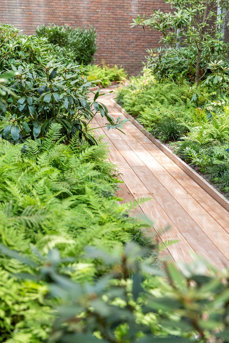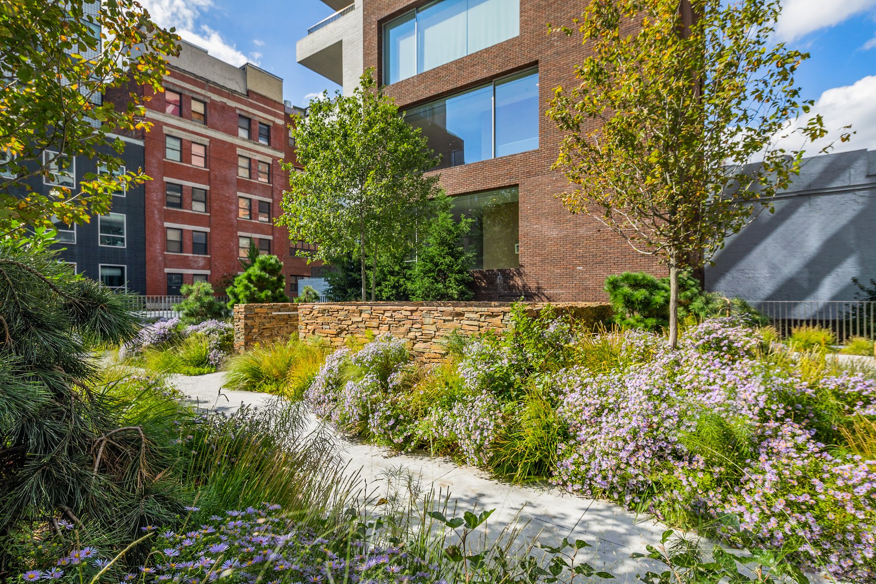Jardim is Future Green Studio’s first collaboration with renowned Brazilian architect Isay Weinfeld. These luxury residential units are located in Chelsea adjacent to the High Line, one of New York City’s most unique and acclaimed public parks. The landscape design is wild and naturalistic, creating a dynamic contrast with the refined simplicity of the architecture and includes roof top gardens, a marquee lobby garden, private terraces and integrated plantings throughout the building facade. The second floor terrace includes a combination of expansive meadows and rangey, clustered trees. On the private roof terraces the programmatic areas of the pool, the jacuzzi, and the lounging and dining areas are linked by meandering paths of stepping stones. Vines spill over an opening to the terrace below and envelop the bulkhead, creating an immersive garden with stunning views of the city beyond.