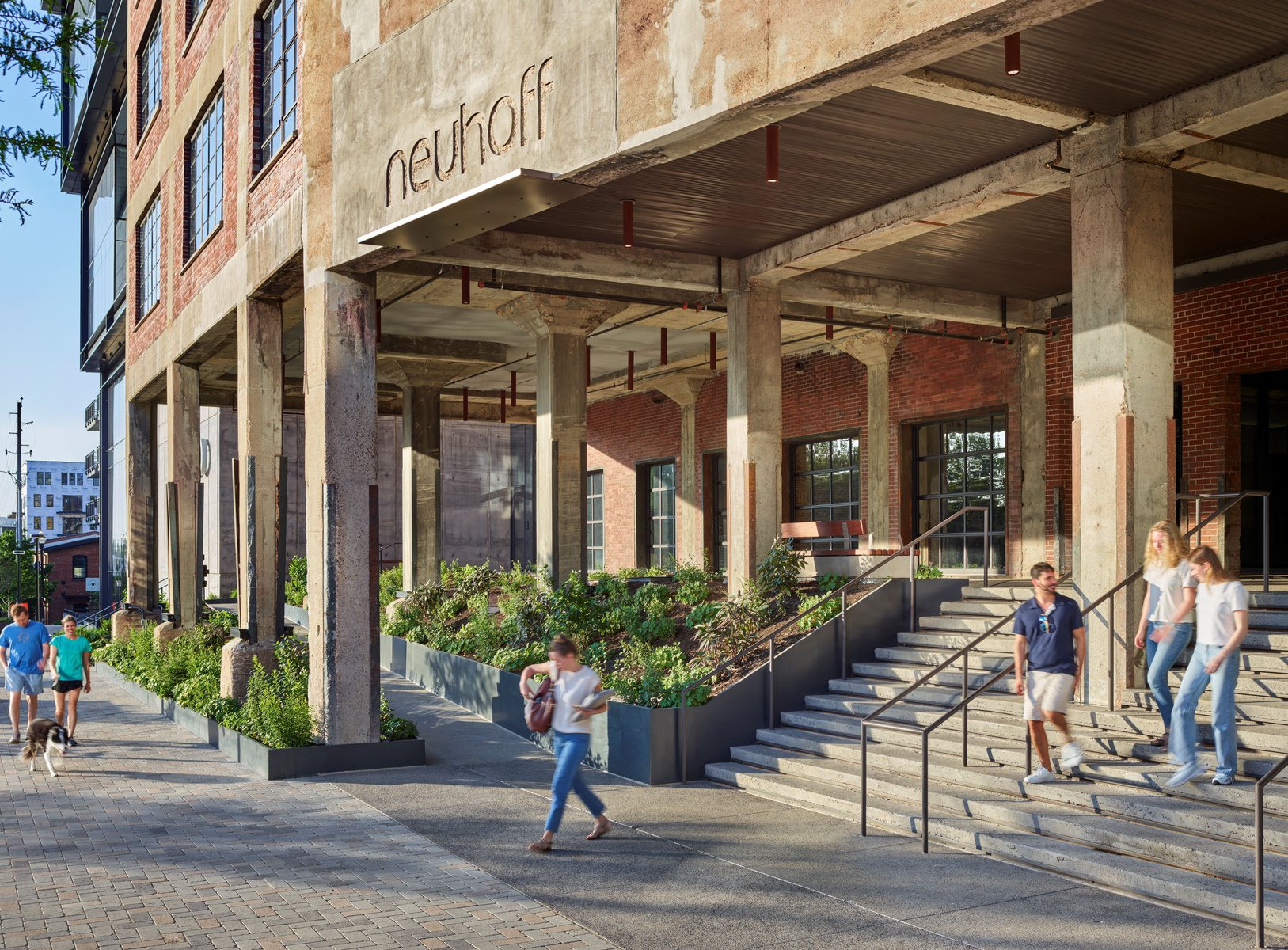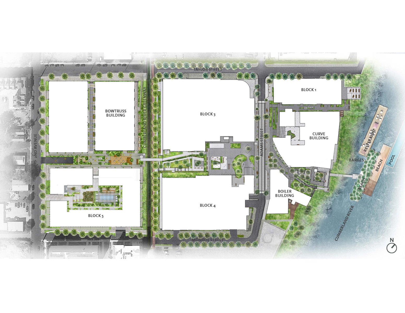 The vision of Neuhoff is a highly curated and strategic preservation of a 12.77 acre waterfront site dominated by a cluster of early and mid-twentieth century buildings and structural ruins to be an authentic, site-derived destination in Nashville for live, work and play. The site is situated just north of downtown Nashville along the Cumberland River and Cumberland Greenway within the historic Germantown neighborhood.