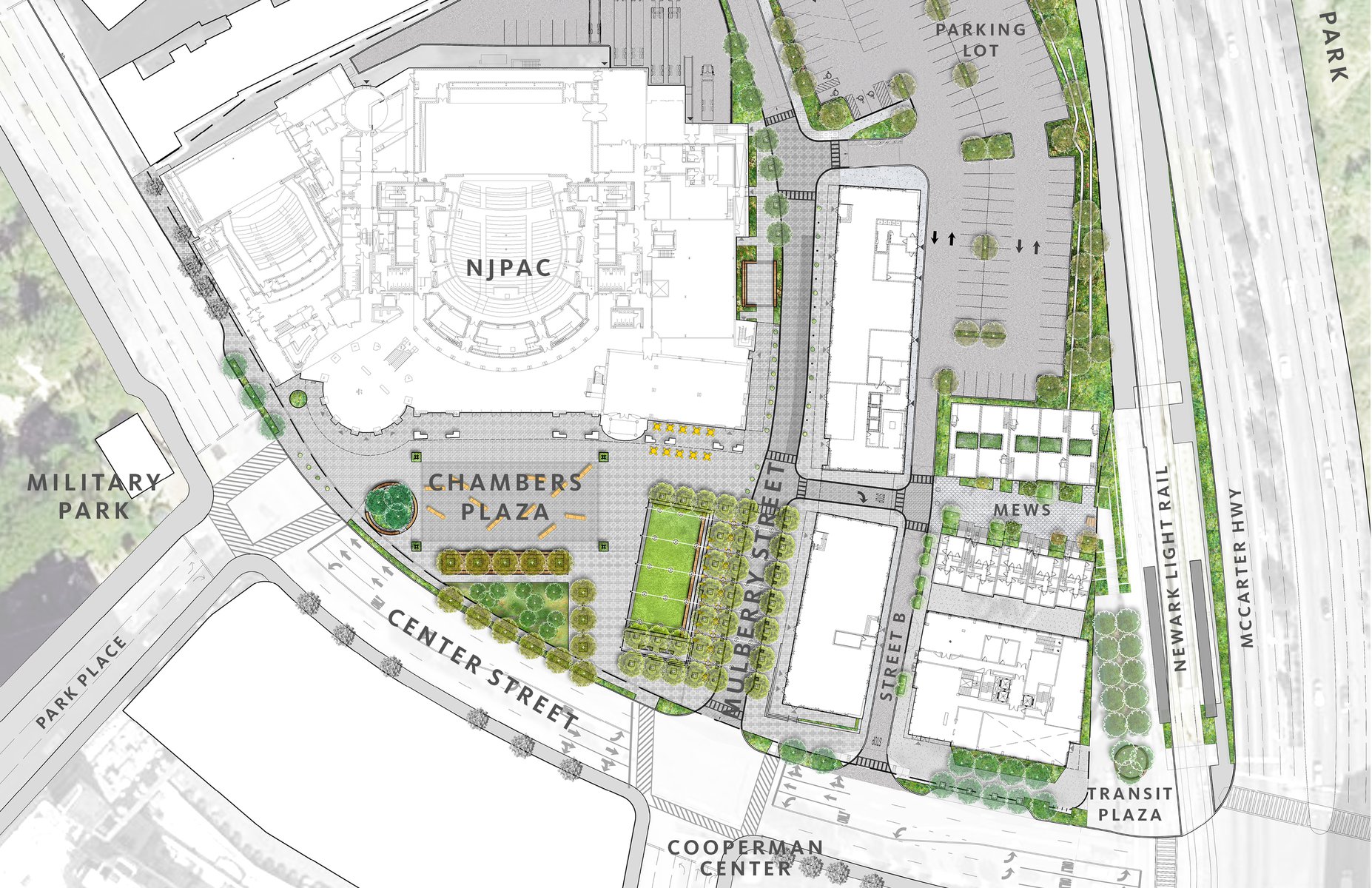NJPAC is the heart of a new Art’s District that includes a series of mixed use residential, retail buildings, and low-rise residences situated around a pedestrian friendly streetscape. Landscape scope includes a 40,000 SF performance plaza, a transit plaza that serves the NJ light Rail, and a shared street. The residential Mews provides a leafy green pedestrian street and the Residential towers include a series of lush terraces with opportunities for dining and lounging. Inspired by the NJPAC institution, the landscape design provides an inclusive and flexible design that gives the local community a much-needed vibrant green streetscape and an outdoor living room experience. A connective stone carpet unites the district with a series of programmatic interventions, such as a large flexible lawn, two-way stacked seating, a social circular bench, oversize movable loungers and art programming. A series of truss-like vine columns anchor the central stage and lawn area, providing a support for temporary tent structures, and state of the art stage lighting. The planting scheme is designed with the ecological, poetic, and seasonal performance of the plants in mind. This ecological framework serves the local flora and fauna and helps mitigate pressure on the adjacent Passaic River.
