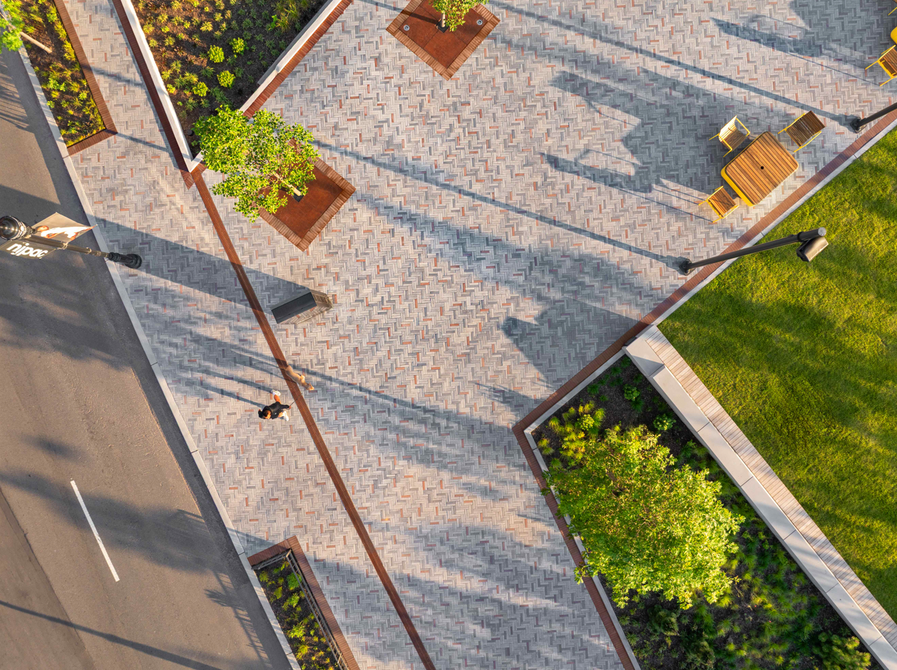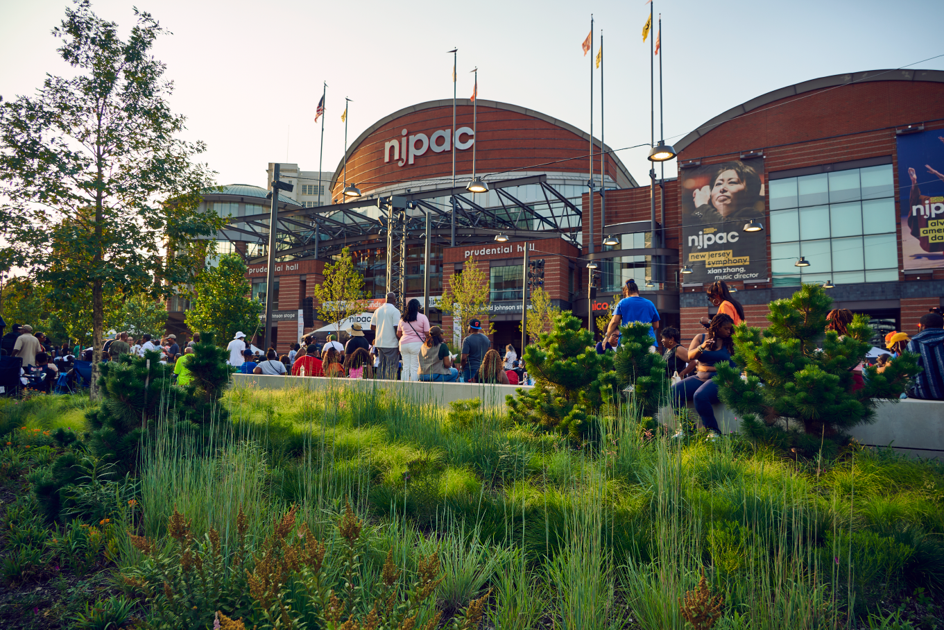 NJPAC is the heart of a new Art’s District that includes a series of mixed use residential, retail buildings, and low-rise residences situated around a pedestrian friendly streetscape. Landscape scope includes a 40,000 SF performance plaza, a transit plaza that serves the NJ light Rail, and a shared street. The residential Mews provides a leafy green pedestrian street and the Residential towers include a series of lush terraces with opportunities for dining and lounging. Inspired by the NJPAC institution, the landscape design provides an inclusive and flexible design that gives the local community a much-needed vibrant green streetscape and an outdoor living room experience. A connective stone carpet unites the district with a series of programmatic interventions, such as a large flexible lawn, two-way stacked seating, a social circular bench, oversize movable loungers and art programming. A series of truss-like vine columns anchor the central stage and lawn area, providing a support for temporary tent structures, and state of the art stage lighting. The planting scheme is designed with the ecological, poetic, and seasonal performance of the plants in mind. This ecological framework serves the local flora and fauna and helps mitigate pressure on the adjacent Passaic River.