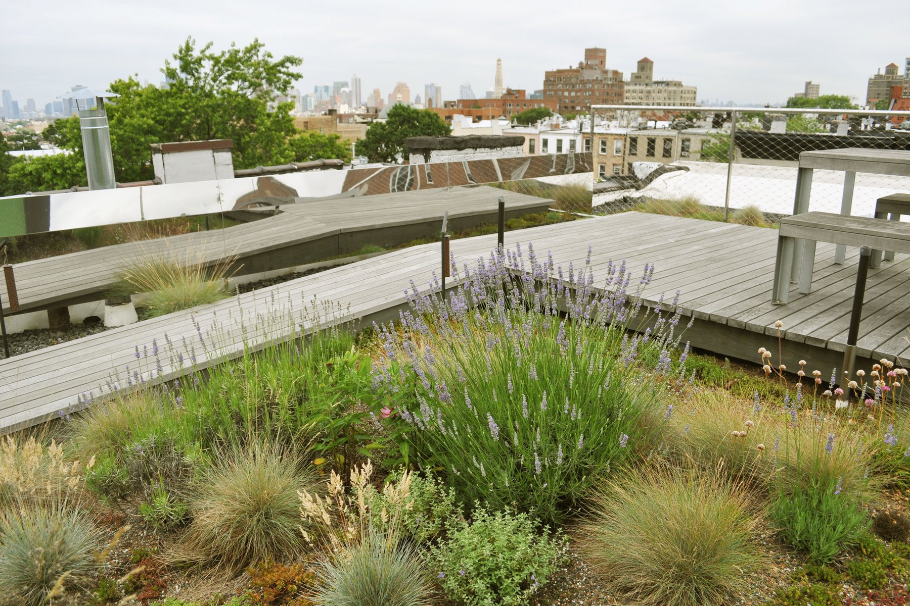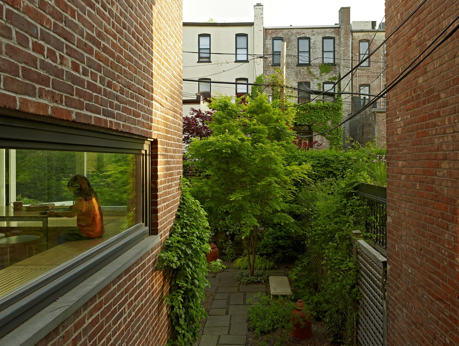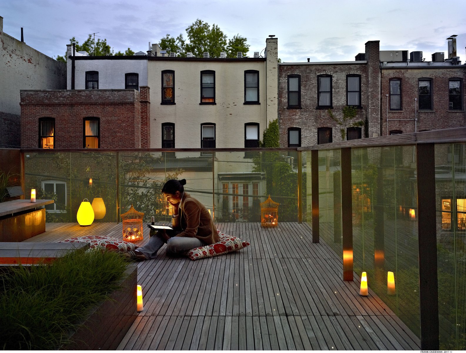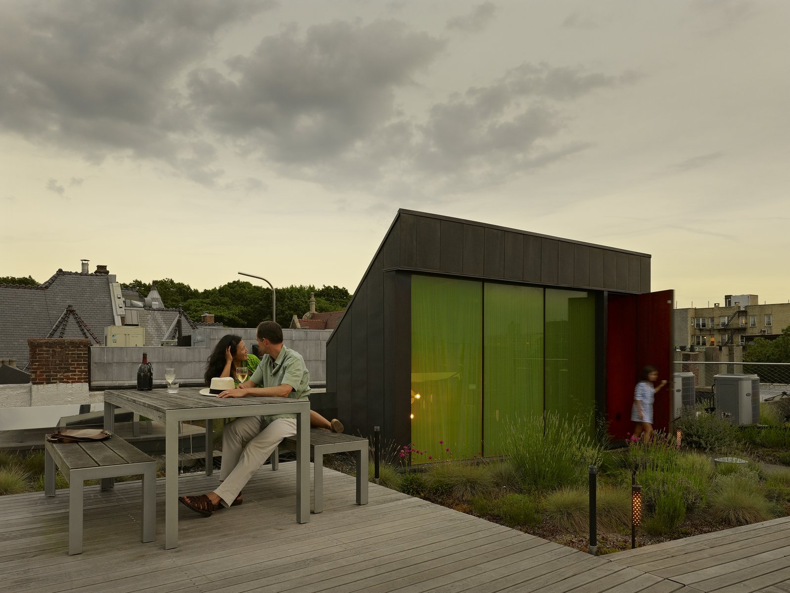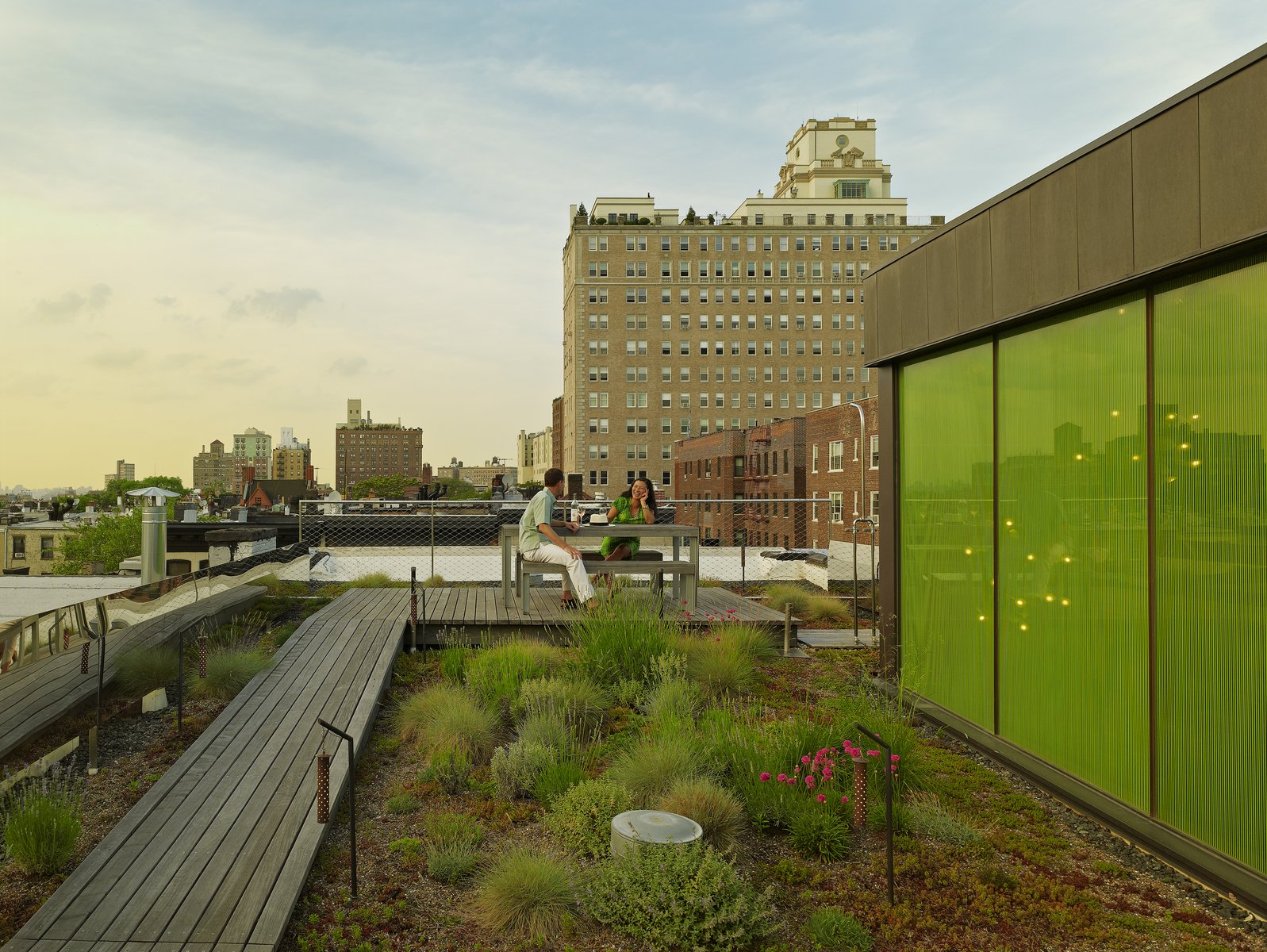 In Park Slope, Brooklyn, a specimen roof garden adds another layer to gracious brownstone living, with an intimate landscape of decking and railing in ipe, stainless steel, and fritted glass. The mixed elevations and textures of self-seeding Tunic Flowers, Buffalo Grass, Aster, Dianthus, Blue Fescue, and Flowering Sedum create an immersive meadow experience, while delicate material touches like reflective surfaces, colorful tinted glass, and perforated lanterns evoke a warm, almost cinematic space. A backyard garden comes alive in winter with a coral-barked Sango-Kaku Maple, providing a shady respite in summer months.