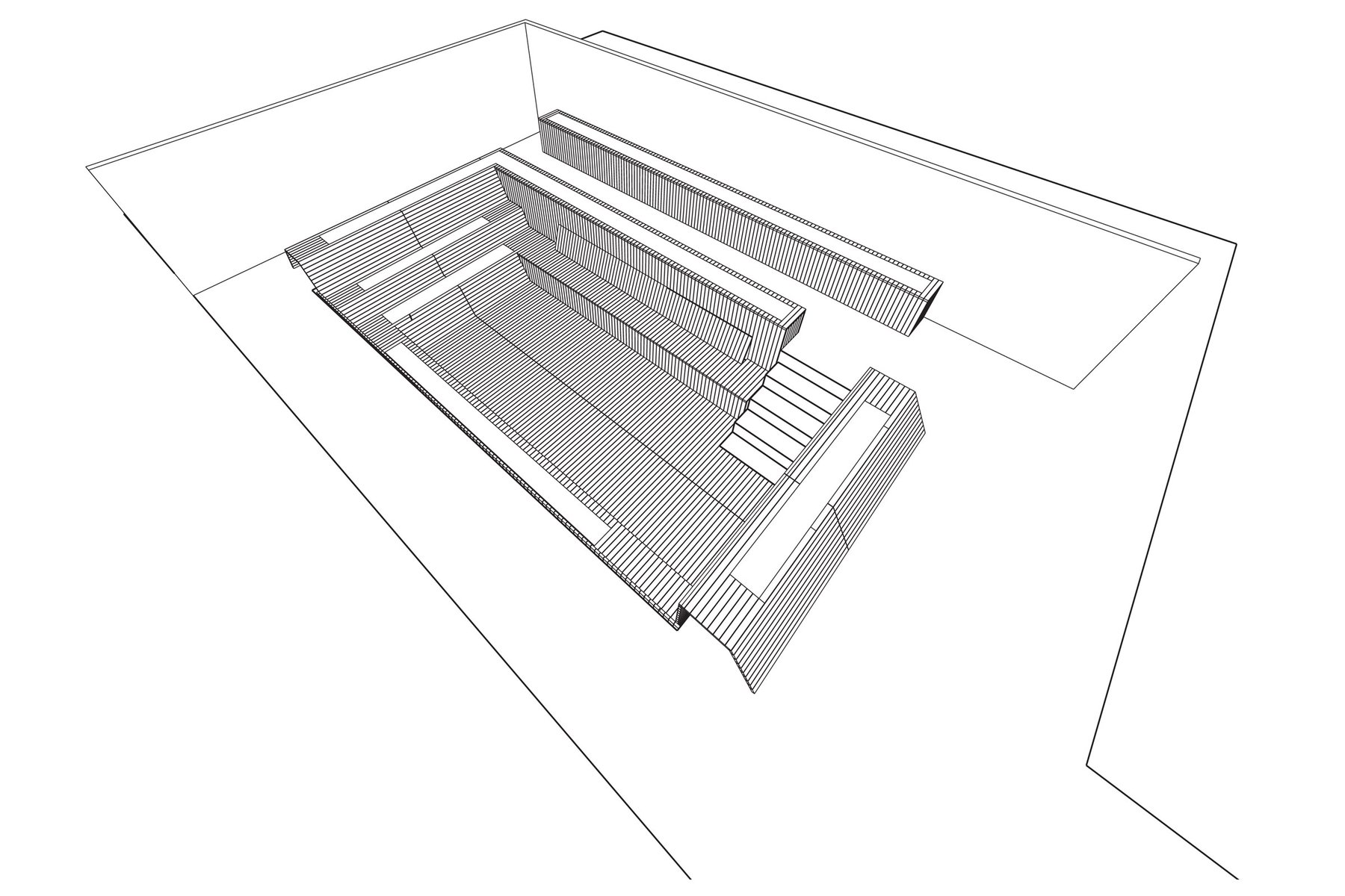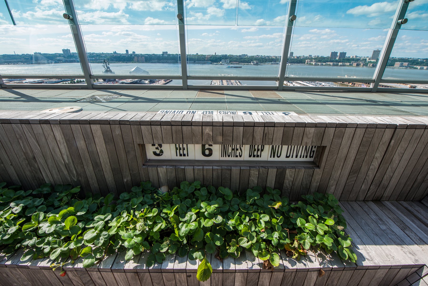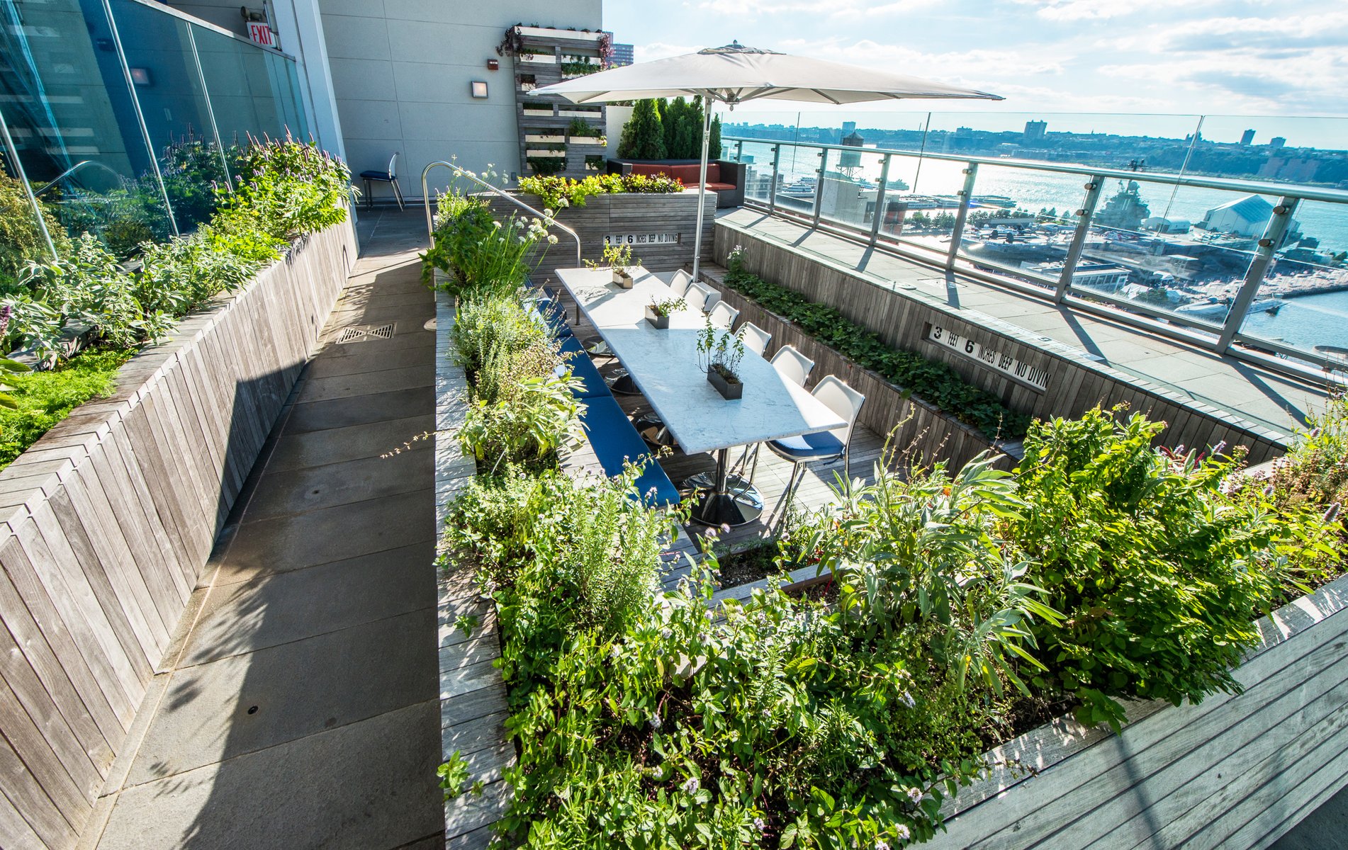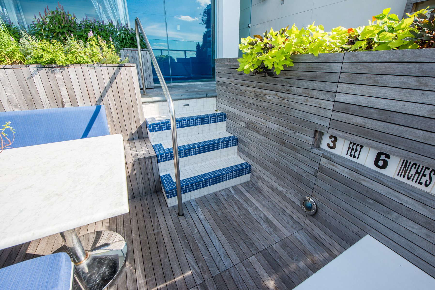 At the Ink Hotel in the heart of Hell’s Kitchen, Future Green retrofitted an unused rooftop swimming pool to create an intimate and immersive culinary experience complemented by breathtaking skyline views in all directions. In consultation with The Press Lounge’s chef and a rooftop agricultural consultant, we selected edible and aromatic plantings for our designed system of wood terraces and planters. The project features Ipe hardwood salvaged from an ongoing interior renovation in forms that are playfully inspired by an unrolled sushi mat—a sequence of decking, planters, walls, and benches unroll to reconcile level changes between the pool and the terrace, creating an intimate, sunken dining space. The pool’s original blue-and-white tiled steps, stainless steel handrails, underwater lights, and graphic depth markers are left whimsically intact. Diners in this unique environment enjoy a hyper-local and seasonal menu, with cocktails, garnishes, vegetables, and seasonings coming direct from the planters around the table.