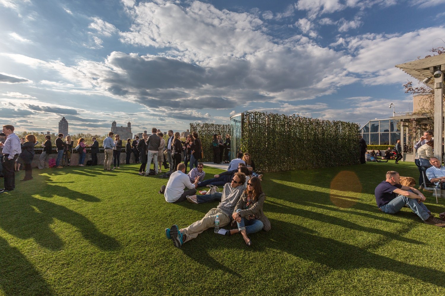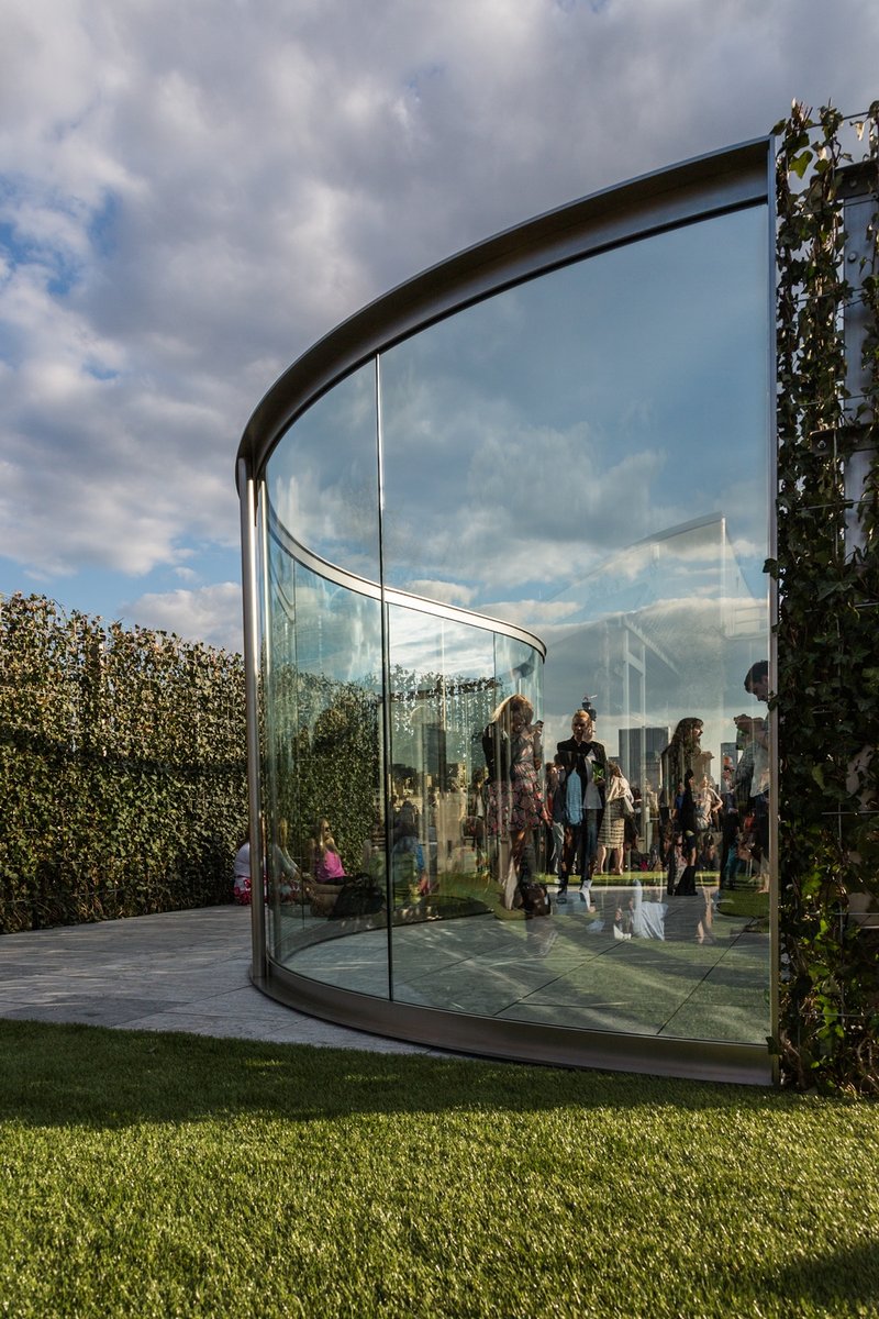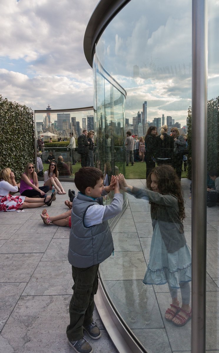 The design utilized curved, two-way mirror glass to cast viewers back onto themselves and borrow scenery from the New York City skyline and Central Park, creating a dialogue between urban and suburban fabrics. Eight-foot hedges frame views into Central Park. Visitors to the pavilion experience the surface textures of a blue-brushed limestone mound as they examine their reflections, transitioning to a carpet of synthetic lawn that spans the entire rooftop.