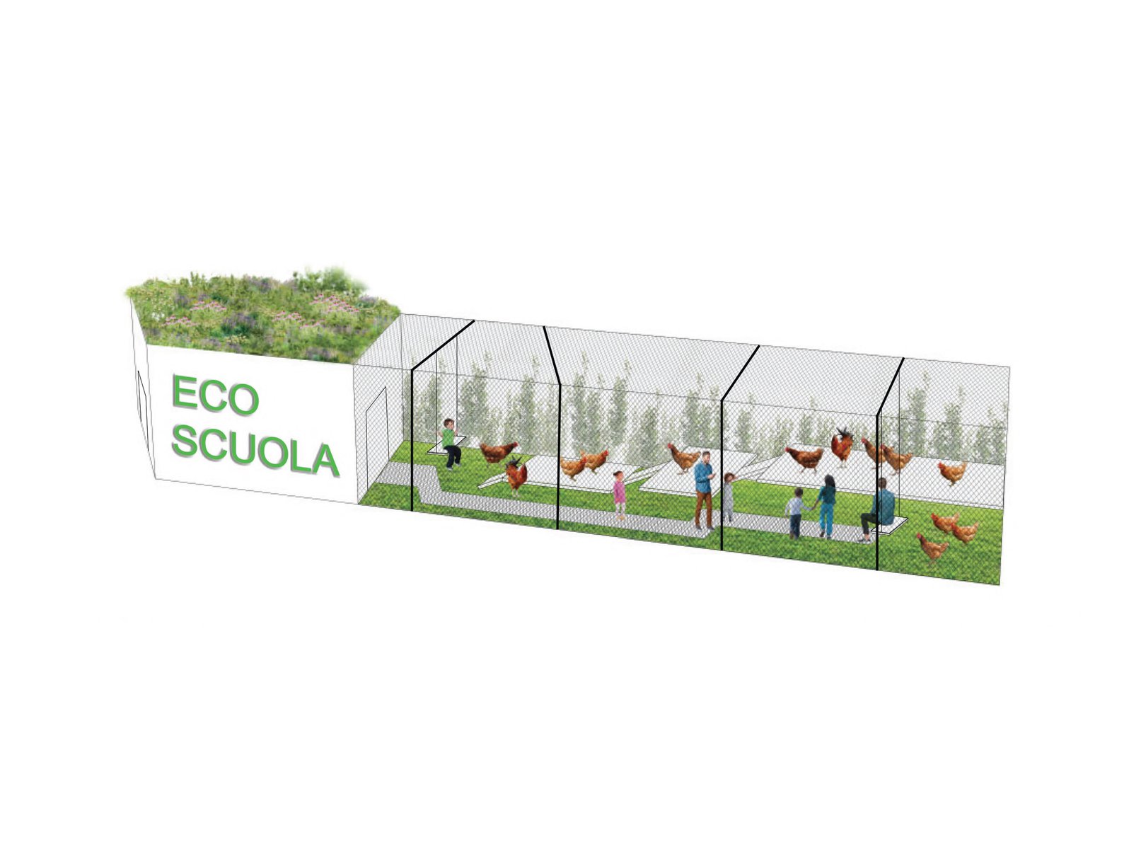 In honoring the Italian ethos of pure farm-to-table cuisine, the spalliera facilitates sustainable agricultural practices by incorporating biodynamic plants and recycling rain water, which reduces the need for chemical fertilizer. Piazzas and walkways become productive farms, encouraging a more seasonal diet and limiting the need to ship and store produce for the cafe.