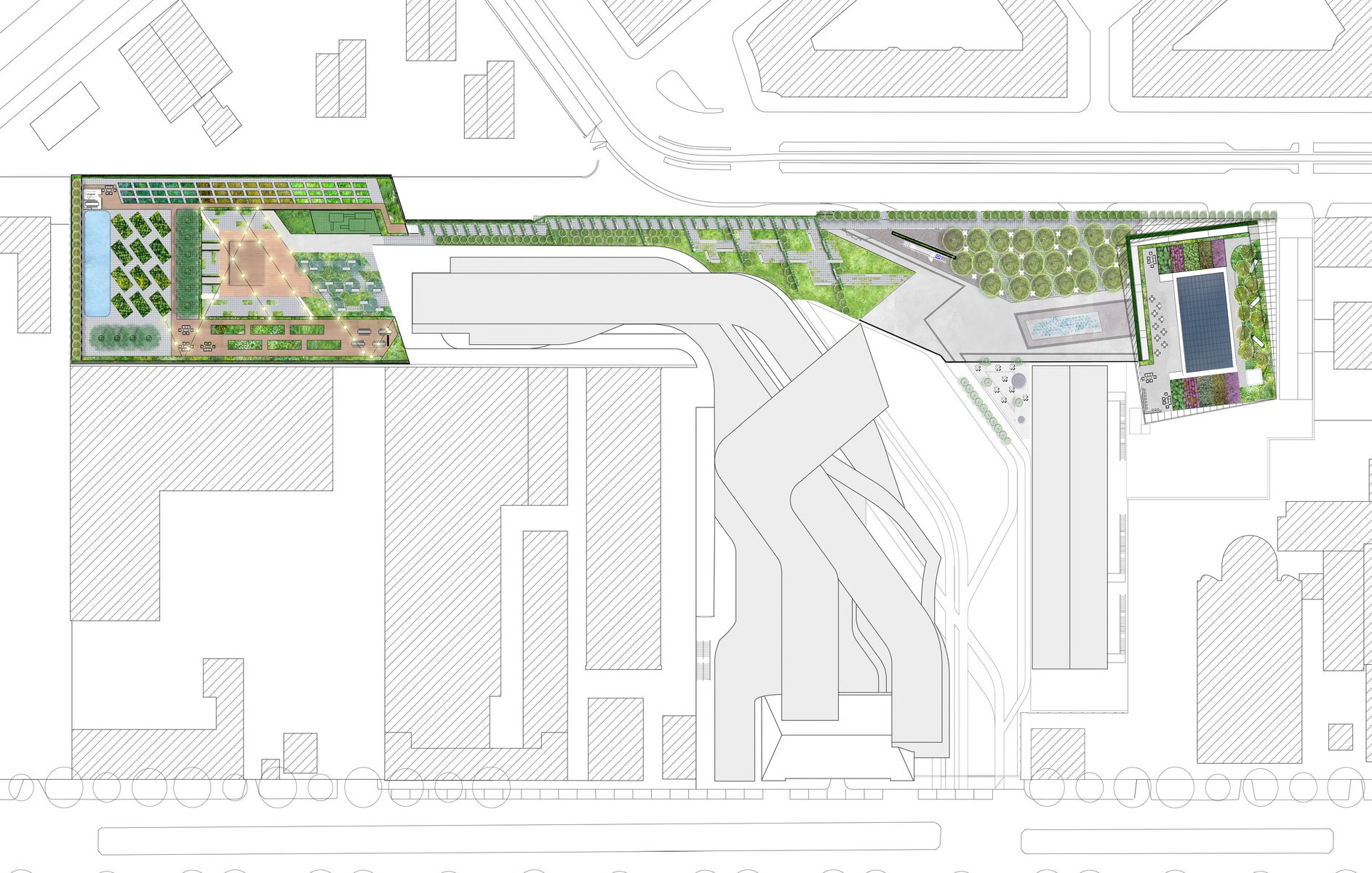 Future Green participated in the MAXXI Art Museum competition in the spring of 2022 along with collaborators Morris Adjmi Architects and WAR (Warehouse for Architecture and Research). Inspired by the agricultural history of Rome, the landscape design draws on the idea of “Villa Rustica”, placing productive gardens at the forefront of the urban experience, and employs spalliera as green infrastructure. Proposed architecture and public space are tied to the existing fabric by the reaching structure of the spalliera. This form also delineates the social spaces between farm, garden, art and play. Planted with local edible vegetation, it twists, flattens, folds, and extends into the public realm to engage visitors through all of their senses. The proposal’s primary goals are to provide sustenance for the community, educate locals on agrarian techniques, and create a strong sense of empathy and connection to the earth and its potential.