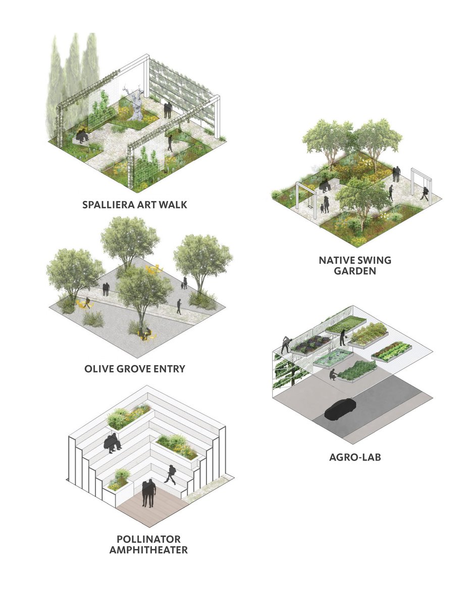 Future Green’s MAXXI design seeks to balance the curated experience with flexibility in programming. Most of the spaces within the landscape serve dual purposes and are rooted in sustainable design. The rain garden is equipped with display trellises to become an outdoor gallery; and the amphitheater is bookended by the eco school and playground, and its seating areas are punctuated by pollinator planting beds. The spalliera is a key constant within this dynamic landscape, constantly connecting and rooting the otherwise fragmented public spaces.