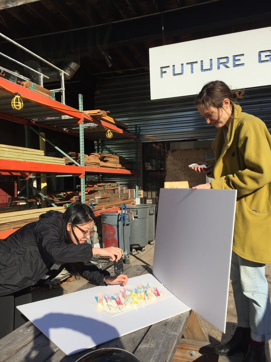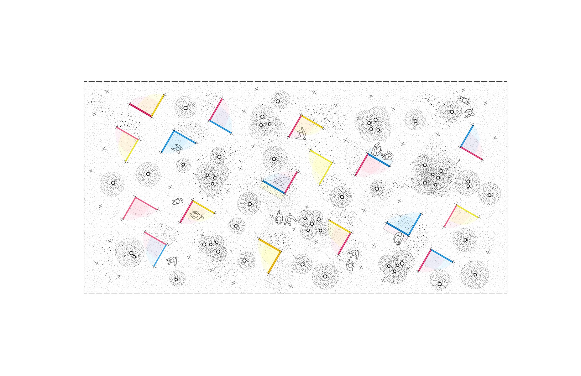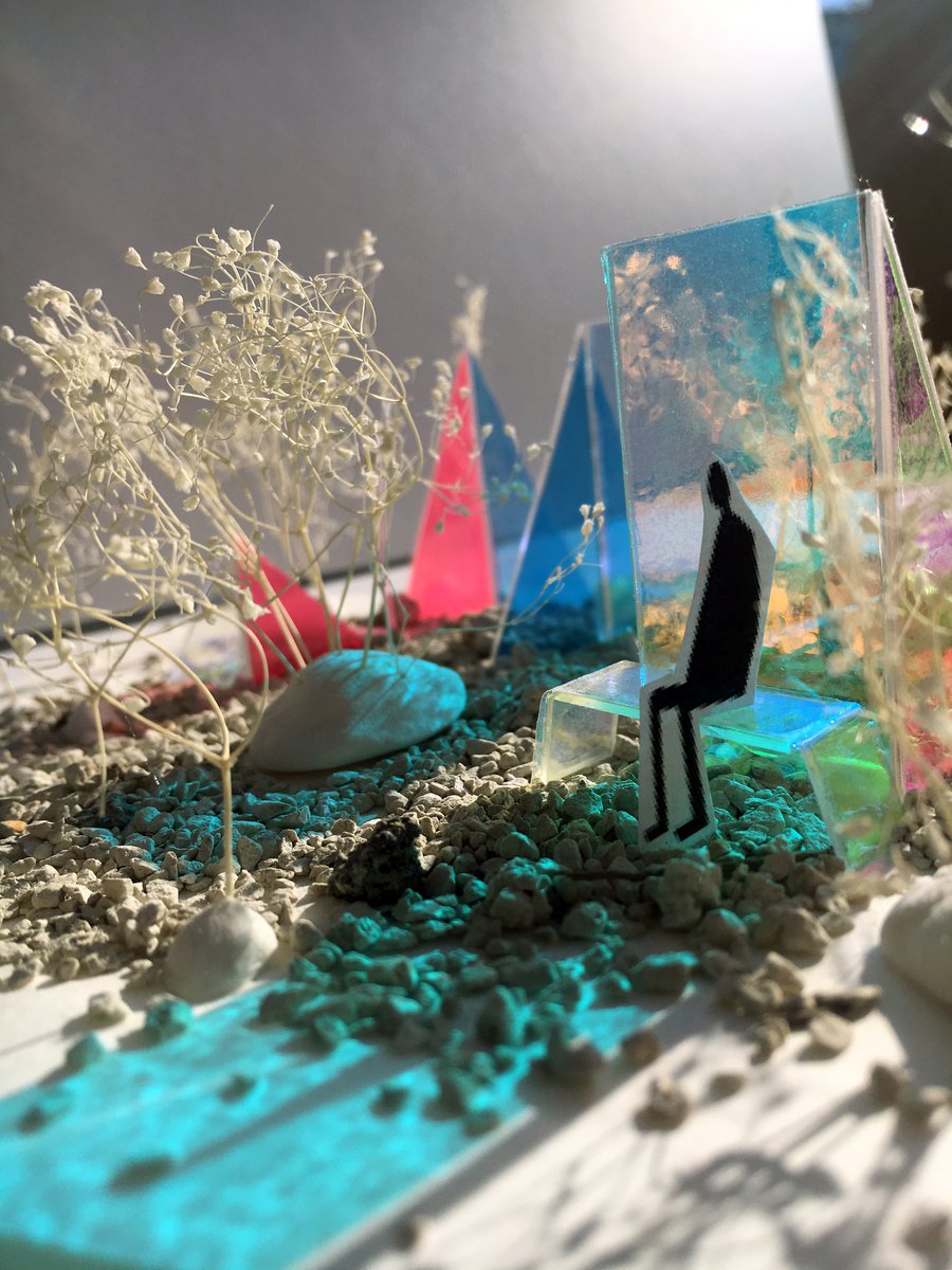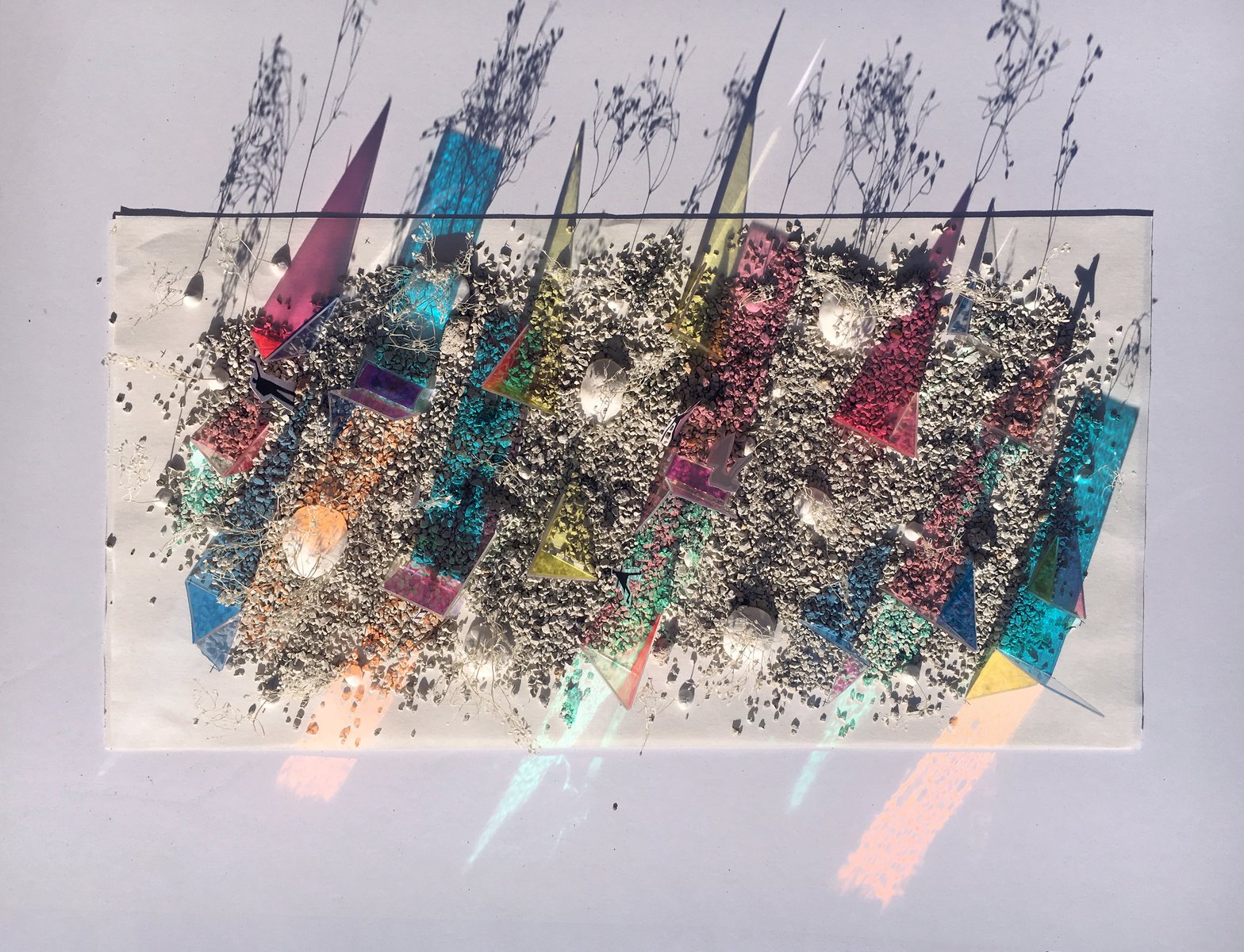 The iridescent qualities of the shelter forms – oriented for maximum sun exposure – refract the sunlight, breaking white light into a dozen component tones and bathing visitor in dense, rich color. Occasional boulders encourage rest and reflection in this warm field of color, while crunching mounds of gravel invite more active exploration – running, leaping, tapping, dodging, listening, looking, feeling. Drenched in rich and unpredictable chromatic tones, visitors are encouraged to follow their own path, seeing – walking – and seeing differently.