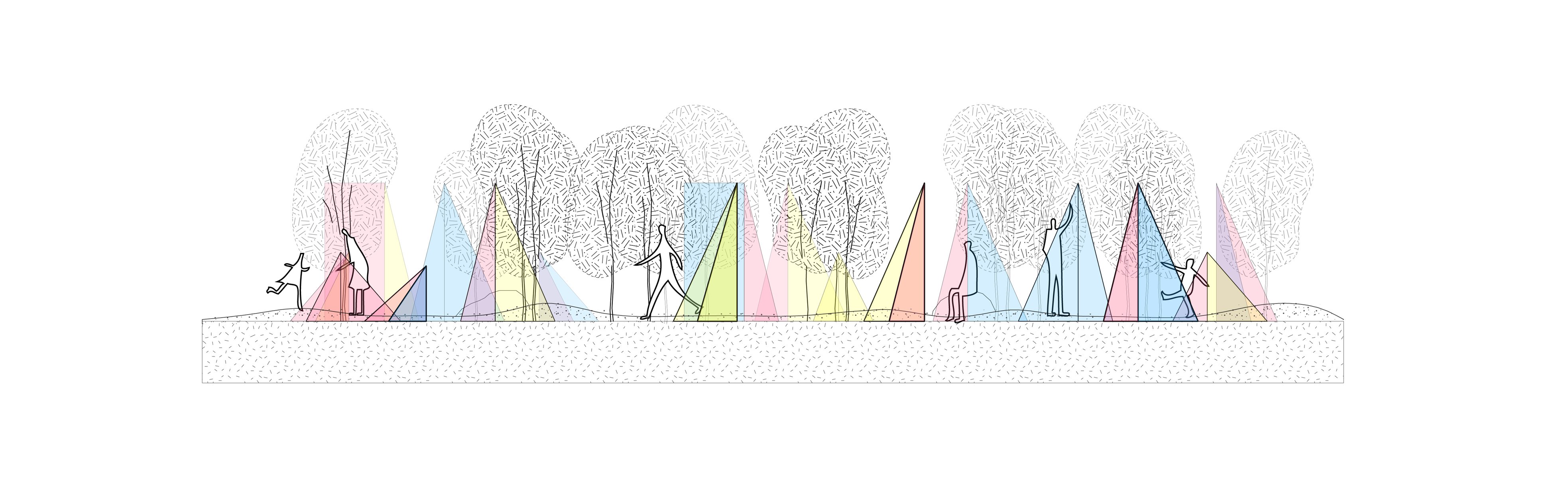 Chroma Forest is a site for immersive experience, wonder, and re-engagement with the bounds of vision and space. It is also a playful reflection, through color, of the regional landscape surrounding Grand-Métis. Colorful, translucent triangles mimic the pyramidal forms of White Spruce in the forest; a colony of Quaking Aspen trees sprouts between, creating ephemeral screens that obscure and reveal as visitors move through the space; while gravel mounds and grassy flows reference the St. Lawrence estuary and contribute a tactile groundscape to the design.