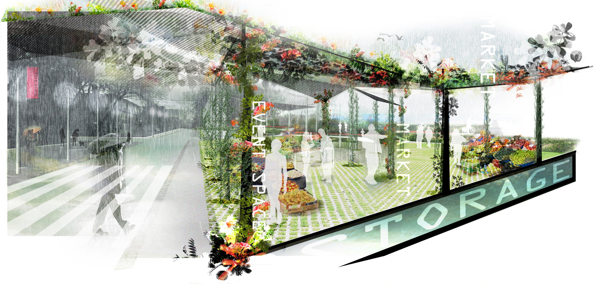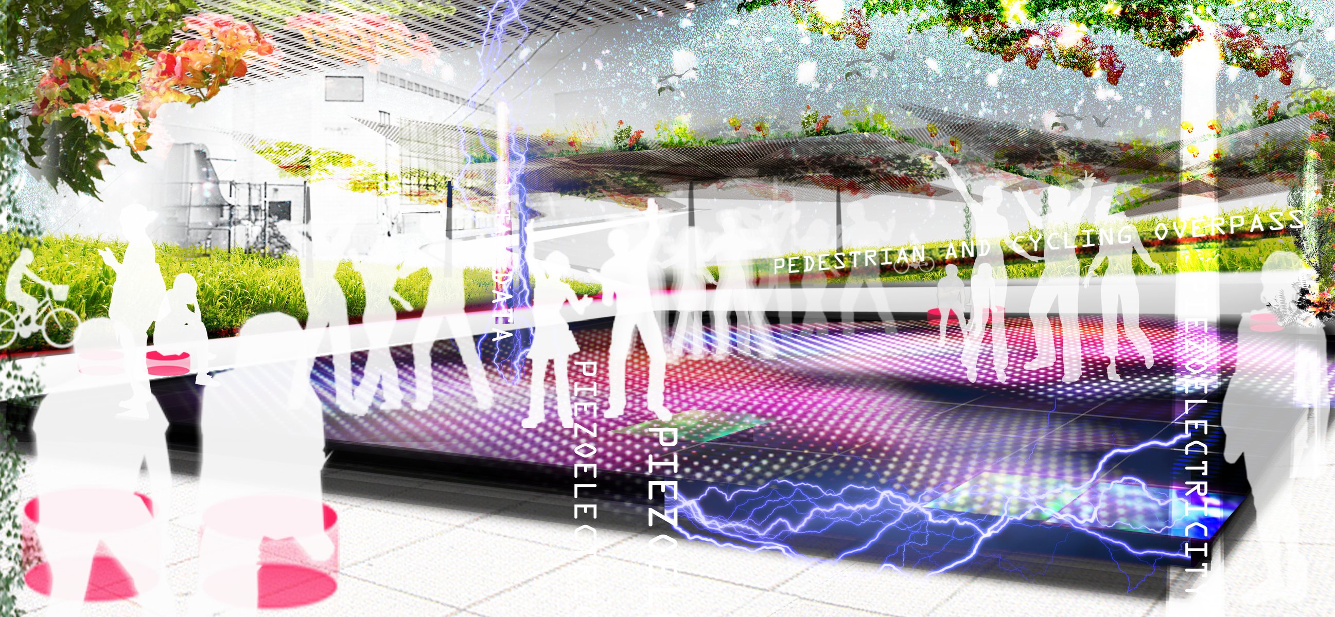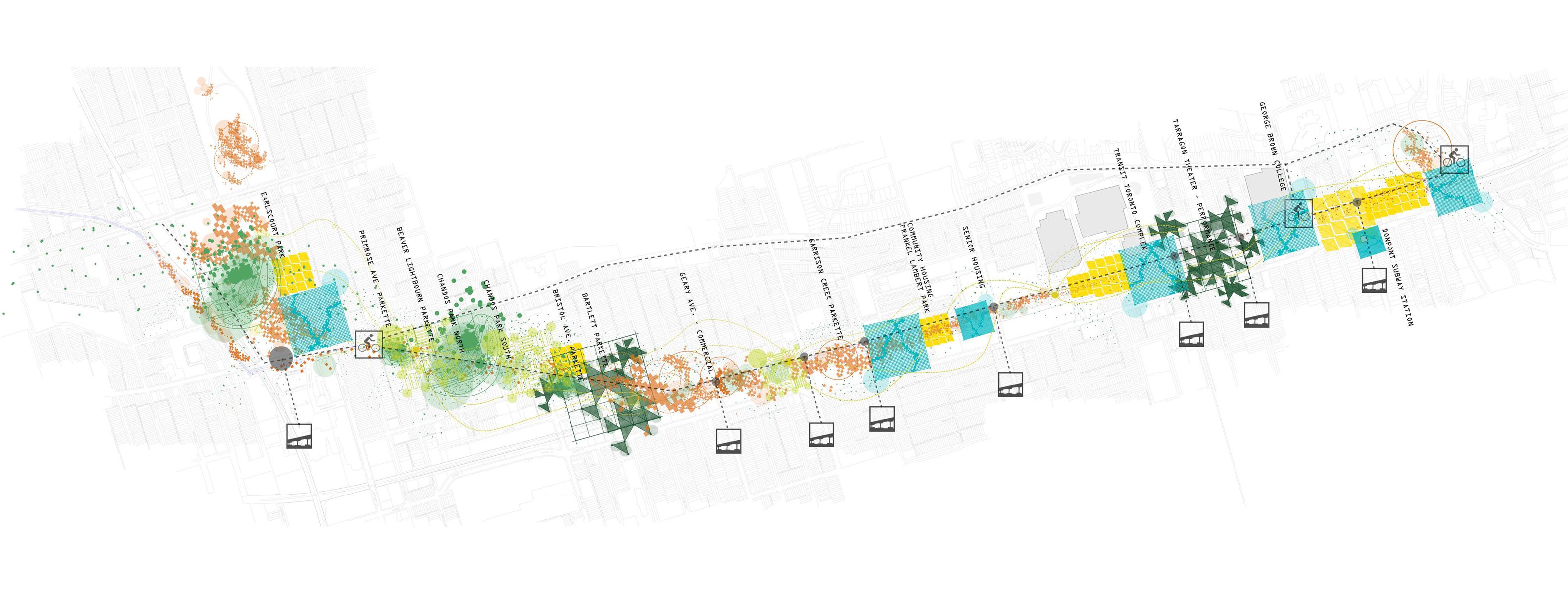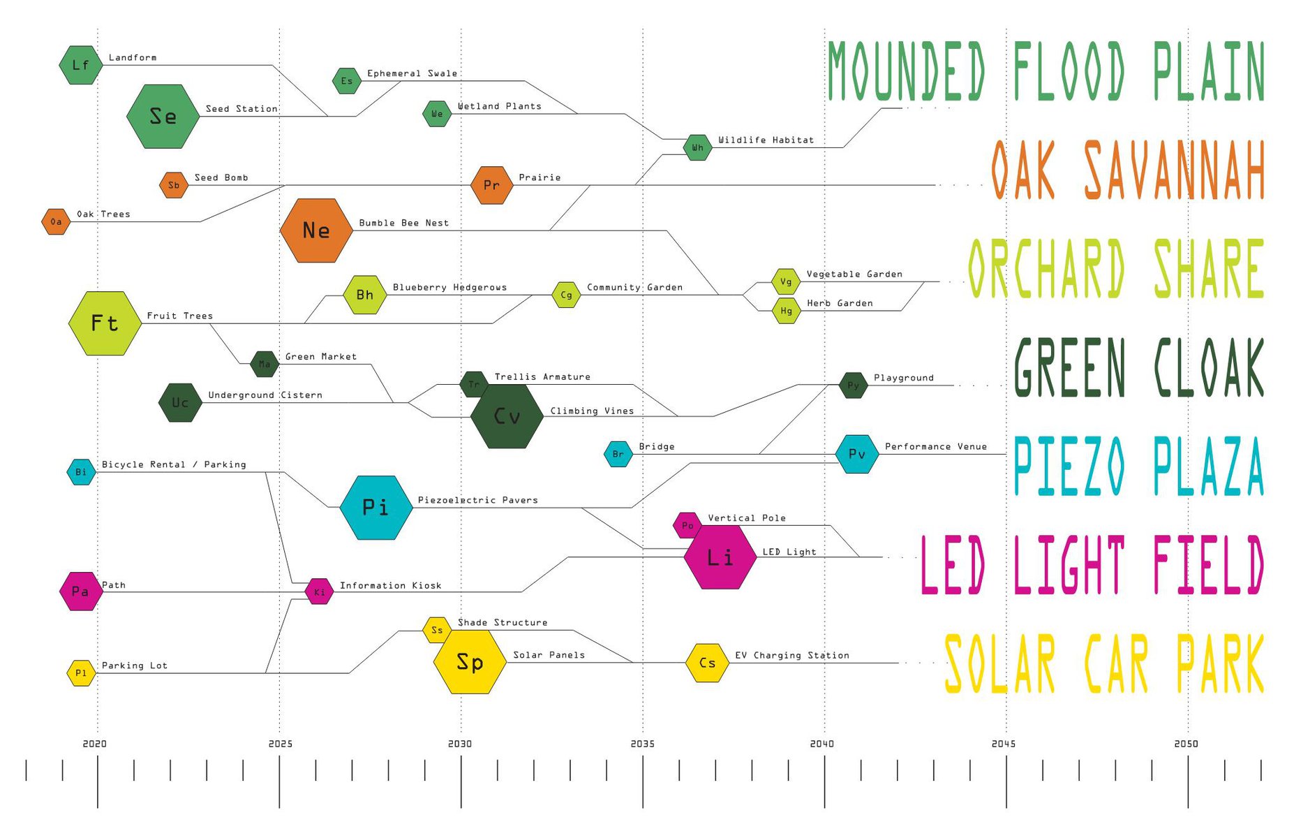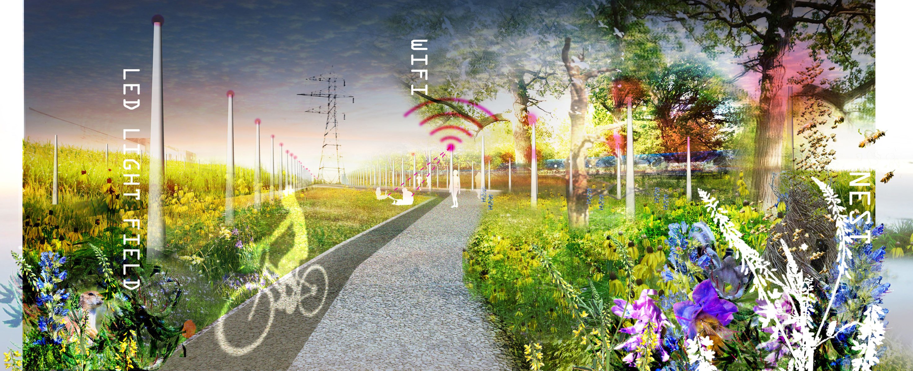 To be employed on the site over a 30 year timeline, the park elements include field strategies like mounded flood plains, piezoelectric plazas, and interpretive light fields which adapt and respond to storm events, the movement of park visitors, and the periodic passing of adjacent trains. These elements make the infrastructure demonstrative, educational and part of the visitor’s poetic experience of the park. Transitional oak savannahs, shared orchard gardens, solar canopy car parks, and trellis armatures with green cloaks create a second canopy in the part to mitigate negative effects of the overhead transmission lines and provide a safe, sustainable park future.