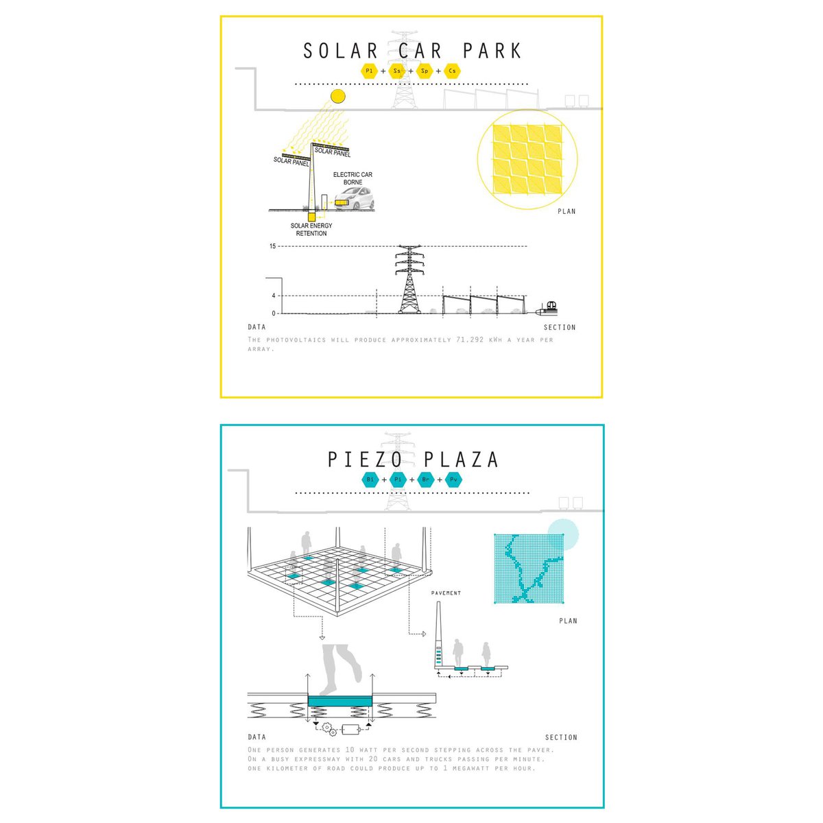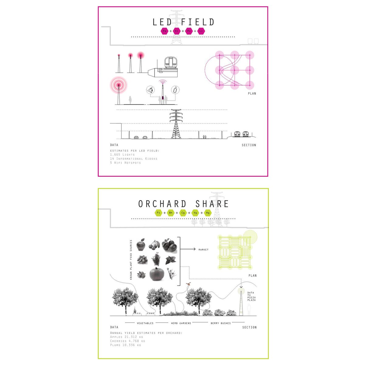 Using a system of field and canopy conditions, the design for the park attempts to merge high-tech energy generating infrastructure with low-tech, minimally maintained landscape interventions. Organized on a grid bearing different spatial densities, landscape typologies called “elements” were developed as a flexible system that can adapt to the programmatic adjacencies, diverse constituents and indeterminate future of the park.